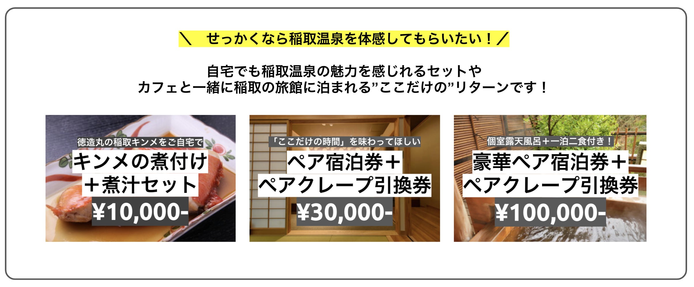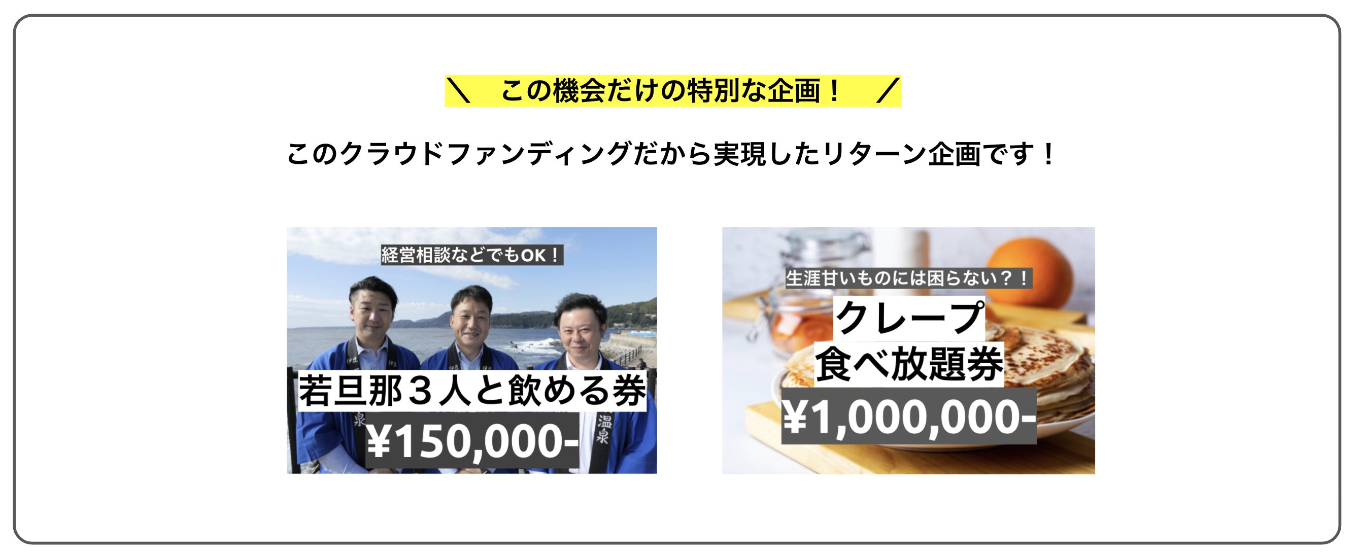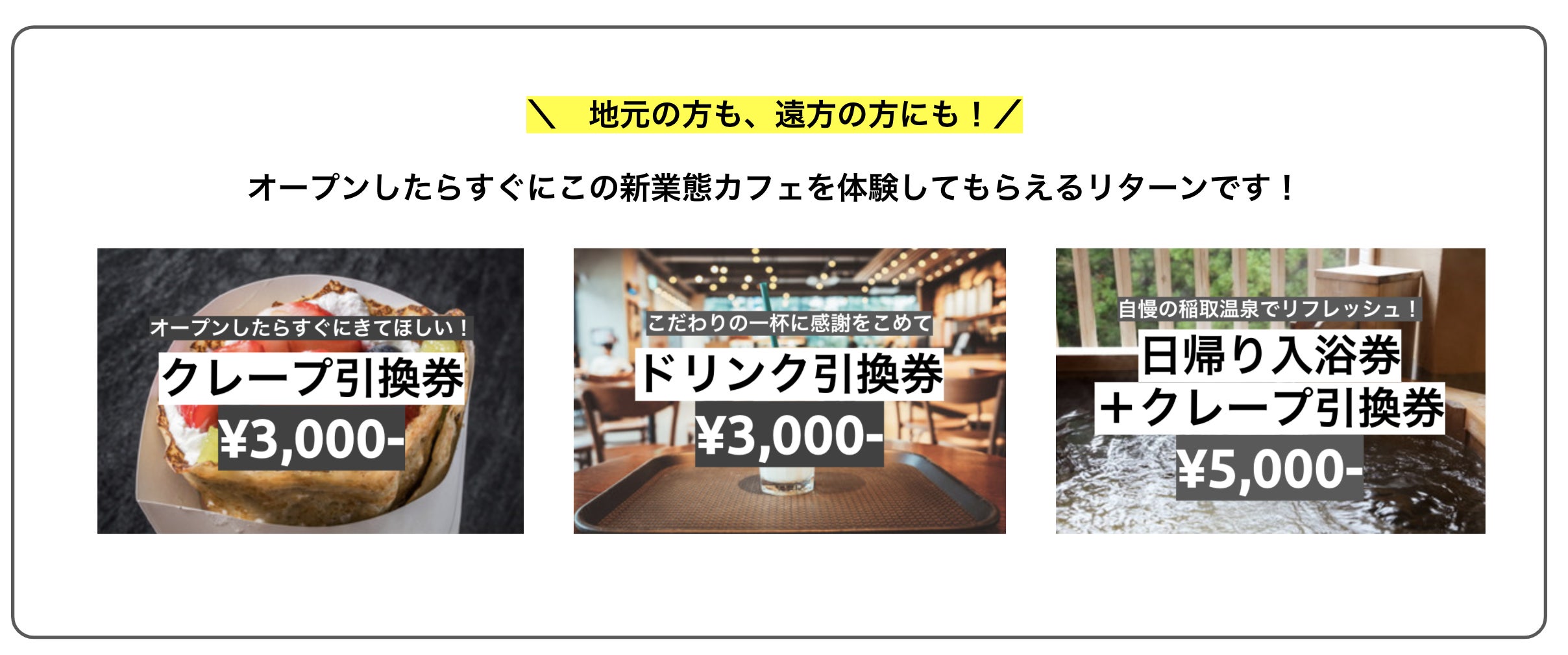 ここまで読んでいただき、本プロジェクトにご共感いただいた方と一緒にこのプロジェクトをよりよいものに成長させていけたら嬉しいです。その参画のきっかけになるようなリターンを用意してみました。純粋応援プランから、実際にオープンしたらすぐにカフェを体験してもらえるプラン、遠方からでも稲取温泉に来ていただきやすいプラン、そして今回だからできるユニークなプランまで考えてみました。
