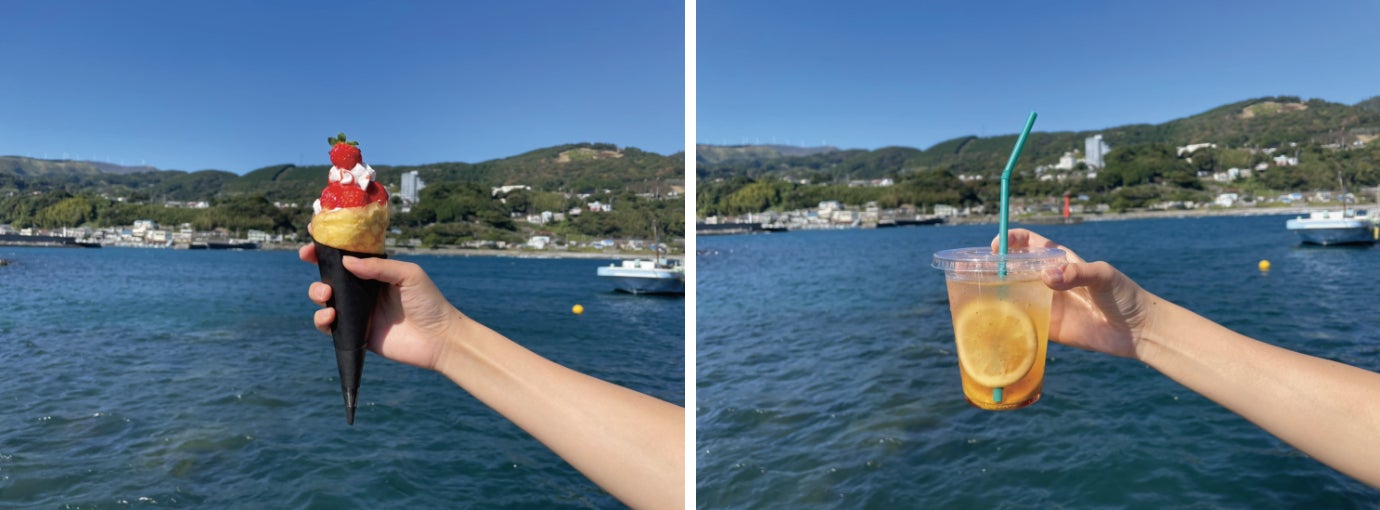 カフェでは観光客や地元客以外にもワーケーションなど仕事でも使えるゆったりと長時間滞在できる空間にします。カフェでは稲取の食材を使ったクレープやオリジナルドリンクを提供します。