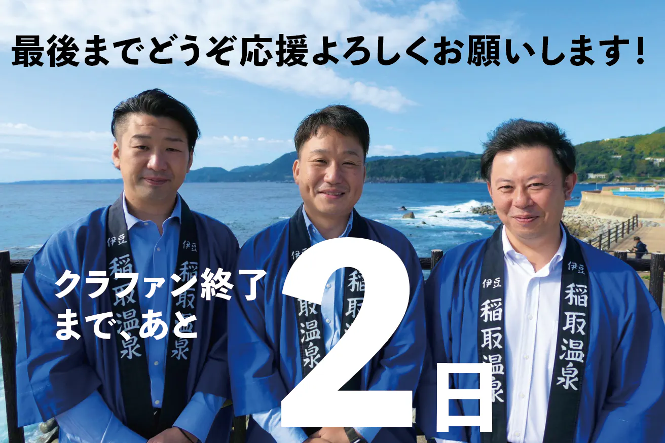 2021/12/06 23:03昨日の0時をもって稲取温泉プロジェクト、クラウドファンディングが終了しました!約1ヶ月の期間で108人、1,778,899円のご支援をいただきました!ご支援・応援いただきました皆様、本当にありがとうございました!!ネクストゴールにはもう一歩届かずでしたが、こんなにもたくさんの方々からの思いを受け取ったことを糧に、今後のプロジェクトもしっかりと進めていきたいと思います。このお礼はリターンはもちろんですが、追ってチームメンバーからひとりひとりからもお礼の気持ちをお伝えさせてもらいたいと思い、とりいそぎクラファン達成のご報告とさせていただきます。そして今後もプロジェクトの進捗を楽しみにお待ちいただけたらと思います。引き続きどうぞよろしくお願いいたします! もっと見る