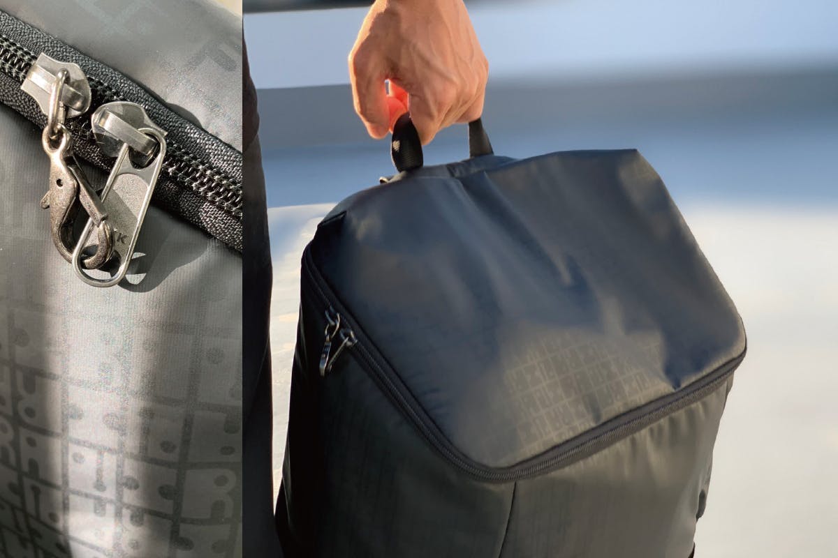 背負っているときに死角となるメインファスナーにはファスナーロック付きで安心