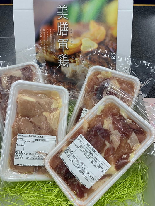 美膳軍鶏の色々な部位をオリジナルセットにしてリターン品としています。