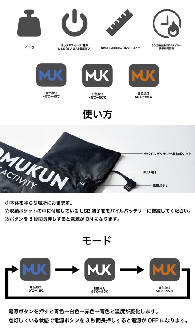 いつでも、どこでも、折りたたんで、軽量だから手軽に持ち運んでお使いいただけるモバイルバッテリー付属折り畳み式温熱シートです。どうぞ「IROMUKUN」をよろしくお願いいたします。
