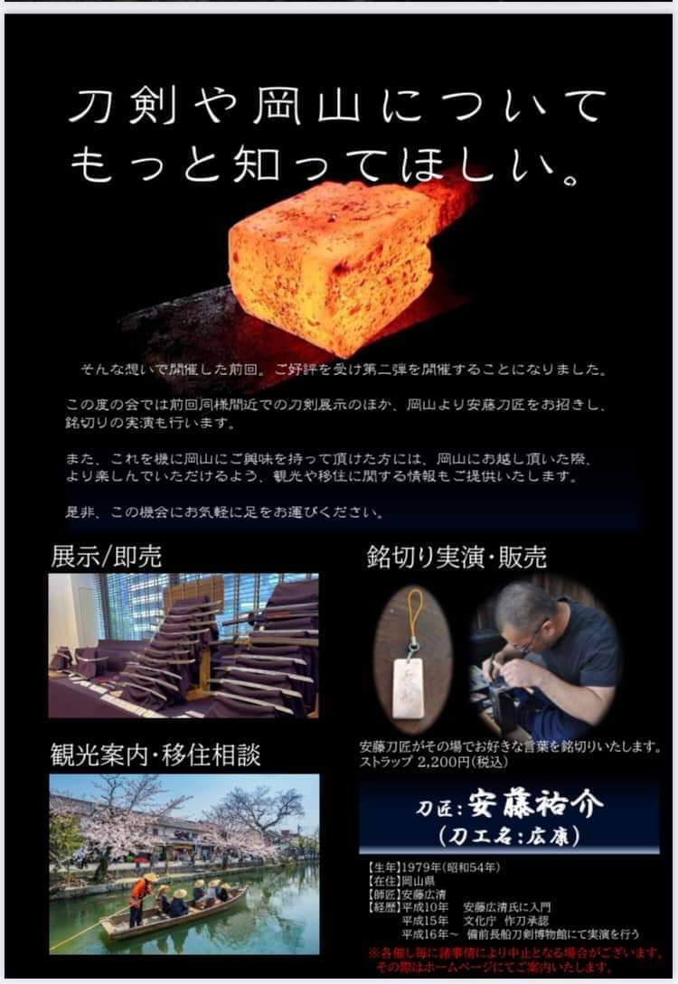 お世話になっております。HITOFURI代表の西館です。刀剣型ペーパーナイフでもご協力いただいている安藤刀匠がこの週末、東京新橋に出張されています。感染対策にご留意のうえ、是非足をお運びください。
