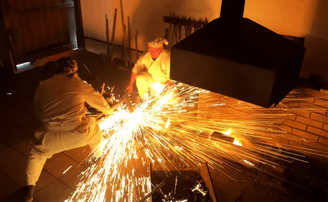 木炭の燃焼熱によって砂鉄を還元することで、鉄を得る日本古来の製鉄方法であり、三日三晩の操業が必要となります。