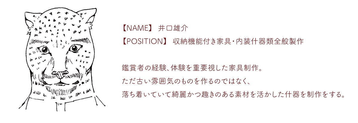 普段は木工をメインとした芸術活動をしており、制作における技術を使って様々なオーダー家具や内装業も手掛けている。