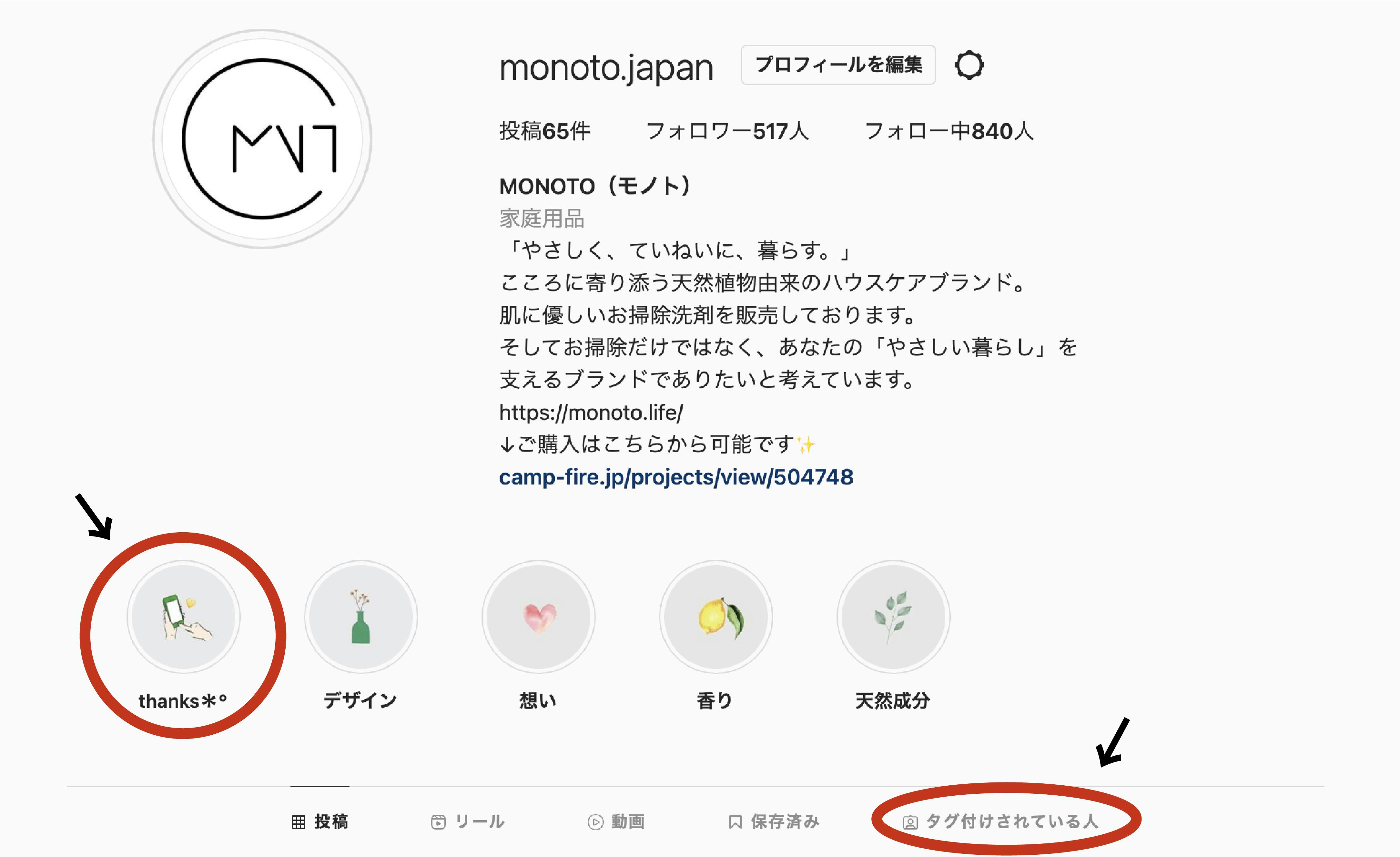 MONOTOの公式Instagramのプロフィール部分にアクセスして頂き、