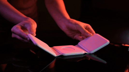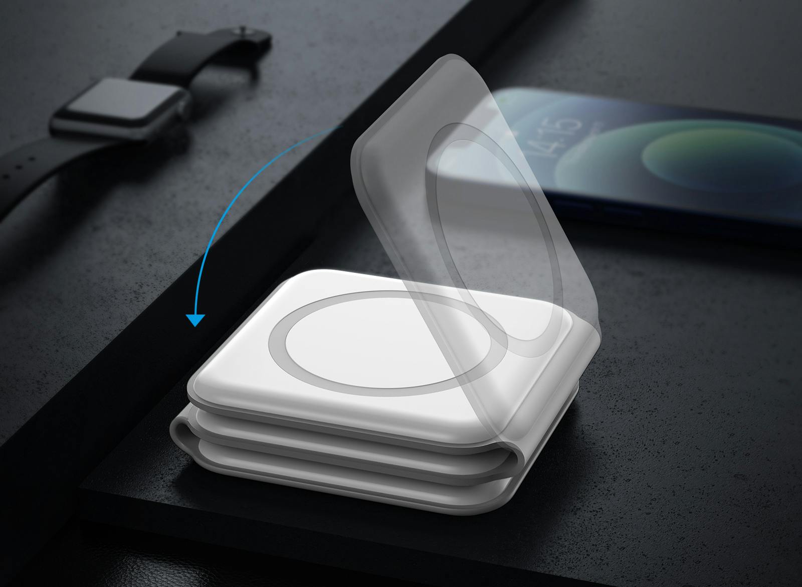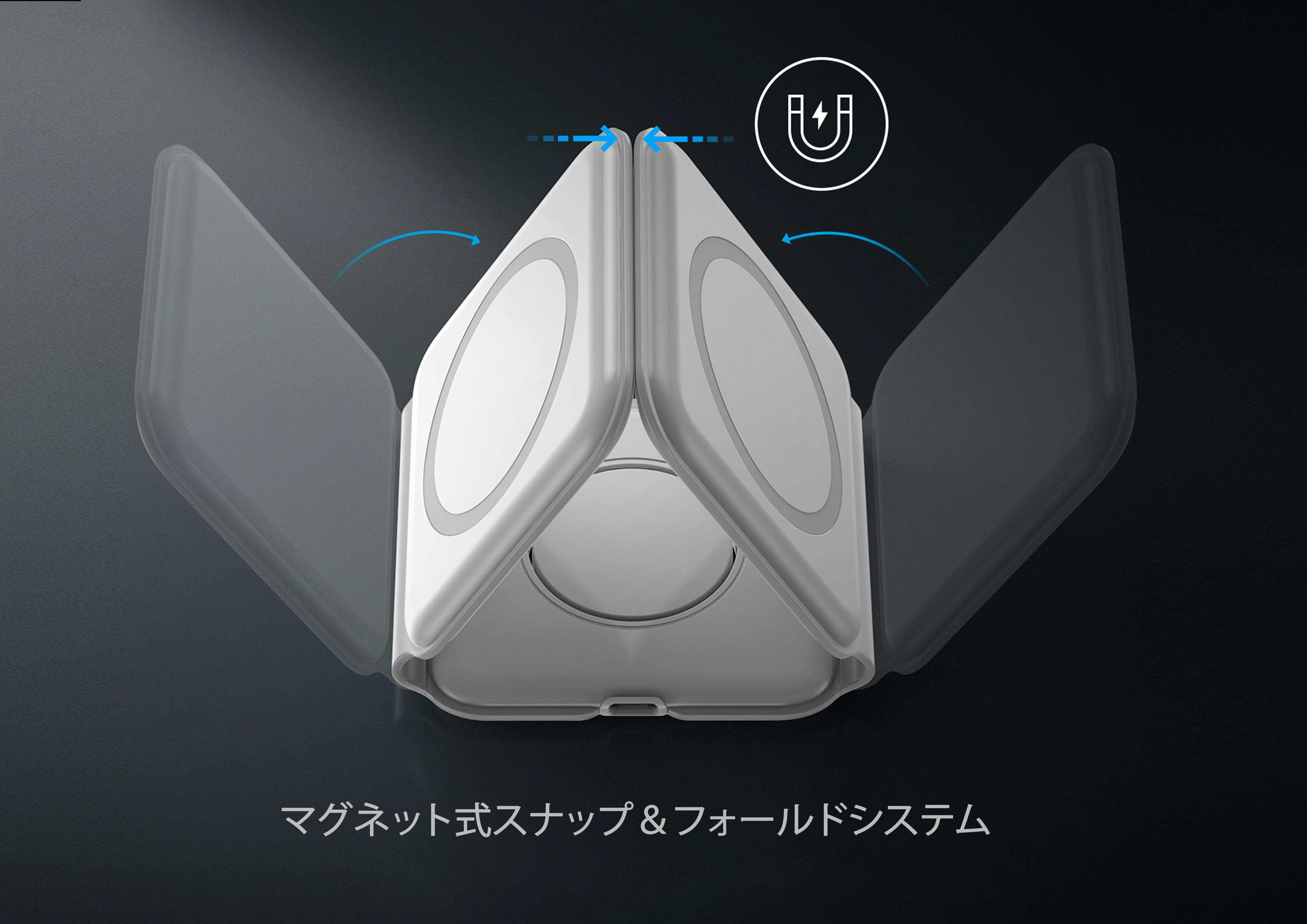 汎用性の高い折り畳み式のデザインを採用したMagStackは、スマホやイヤホン用の省スペースな単一デバイス充電器にもなります。