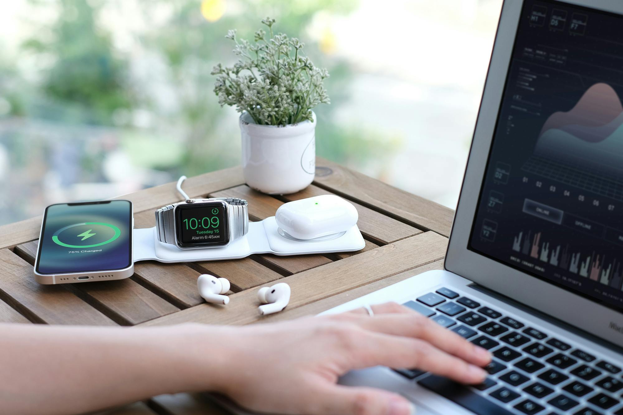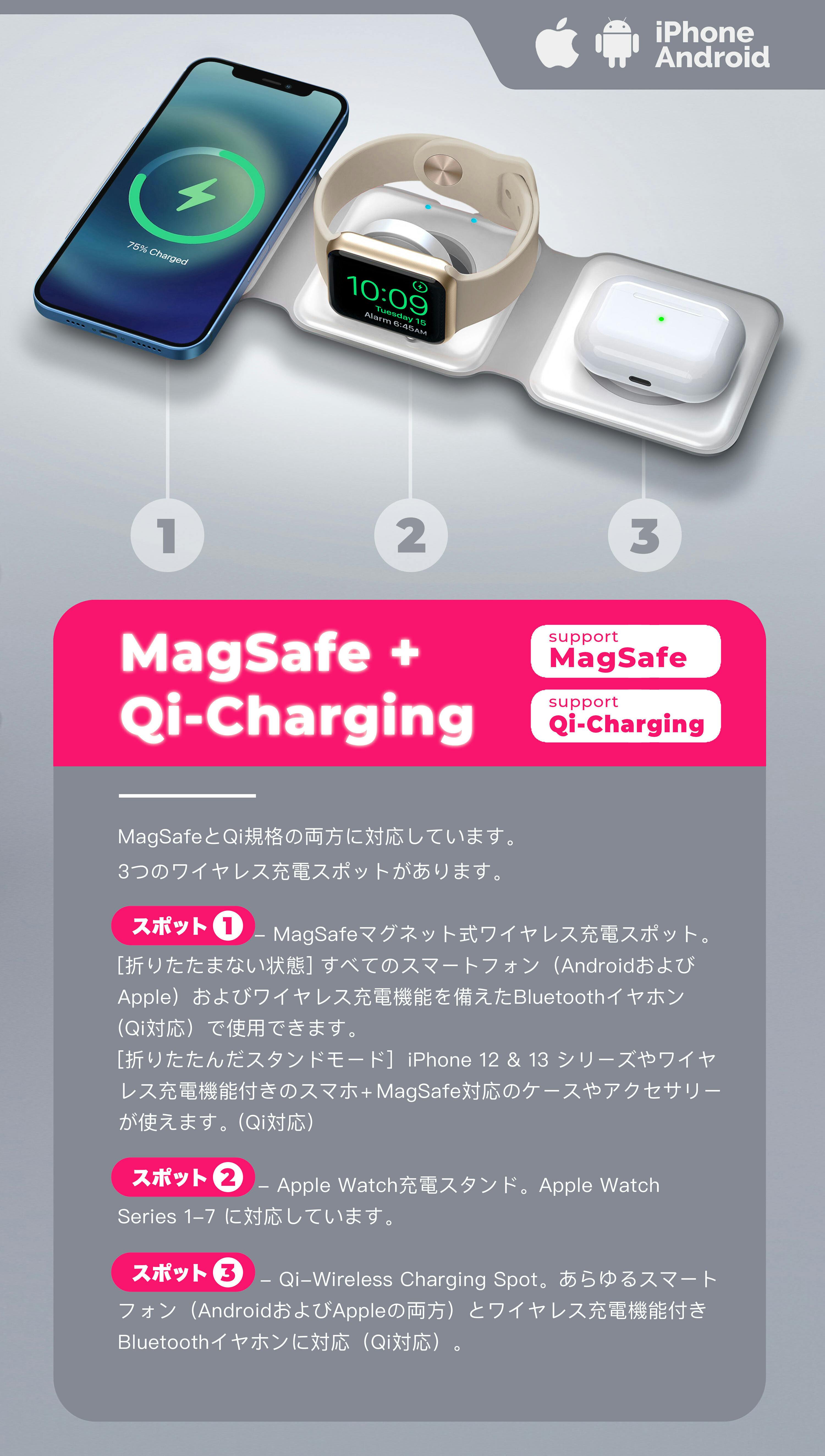 MagStackは、高い汎用性を備えています。iPhone、Apple Watch、AirPods、その他のQi対応Androidスマホ、Bluetoothイヤホンなど、最大3つのデバイスに同時に給電することができ、基本的にQiまたはMagSafe対応のあらゆるデバイスに対応しています。