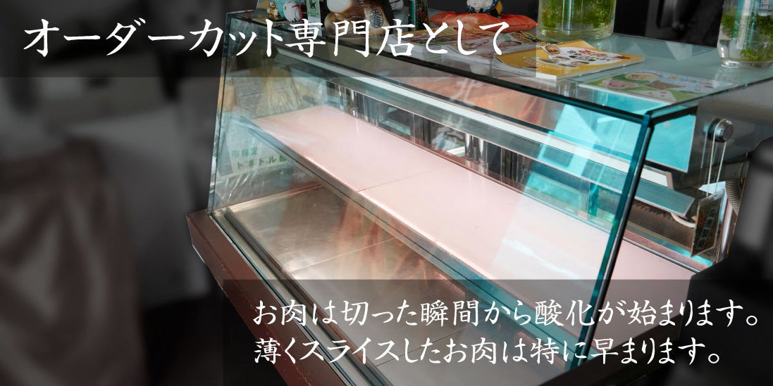 草津にある店舗は、もしかすると肉の置いていない肉屋さんとして認識されているかもしれません。もともと、スーパーにあるようなお店同様に、各種類揃えて切って並べていたのですが、お客さんもそれほど多くはなく、ロスも多く、店舗のリニューアルを機にオーダー受けてからカットするオーダーカット方式の精肉店のスタイルに変更しました。