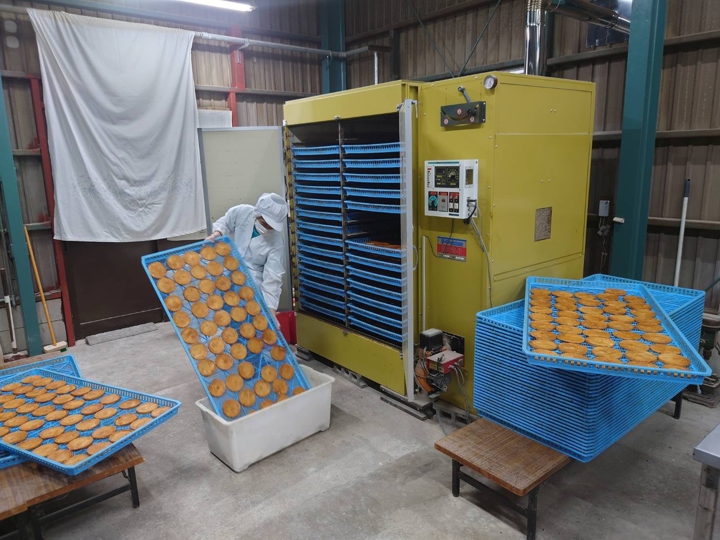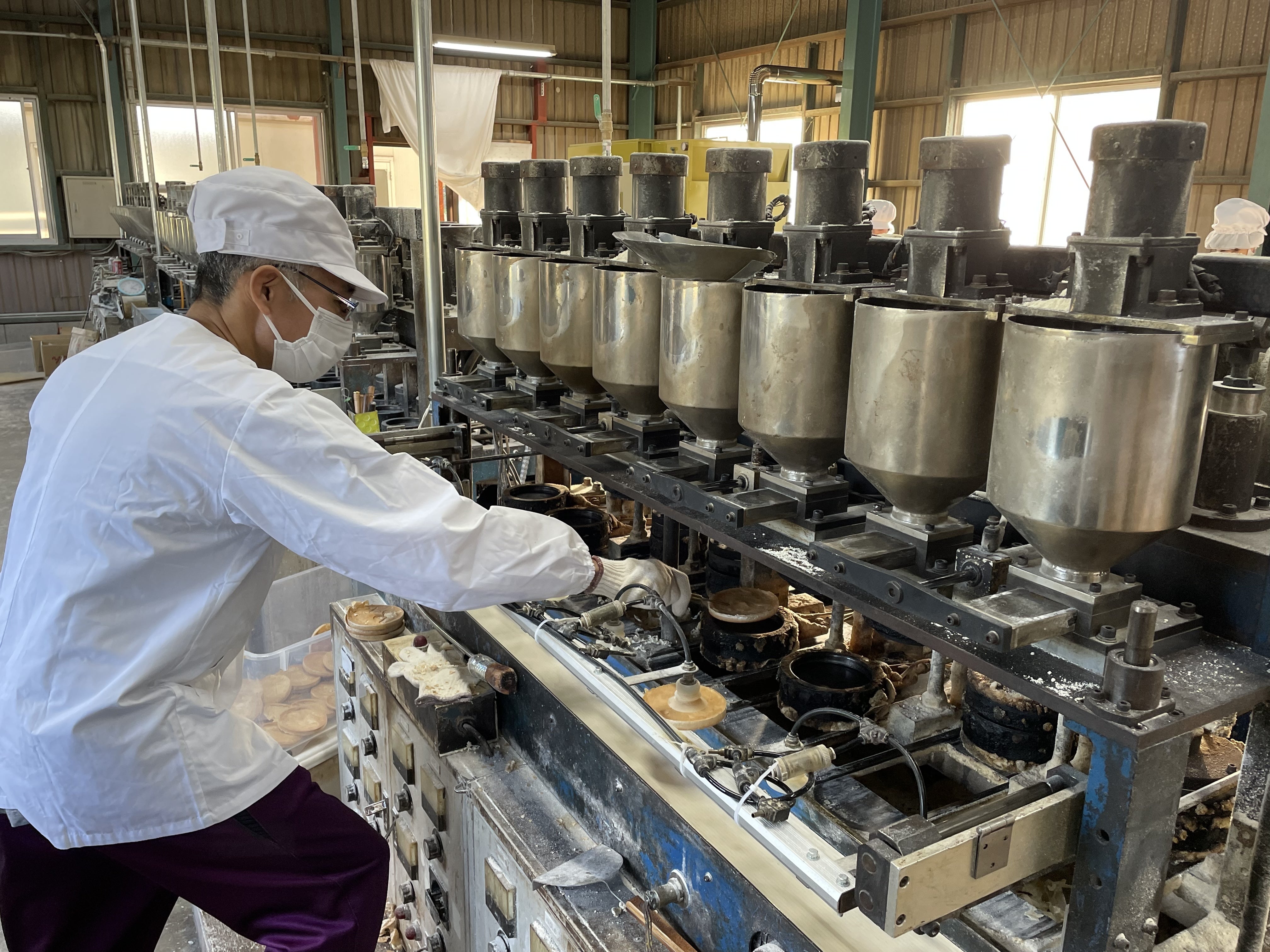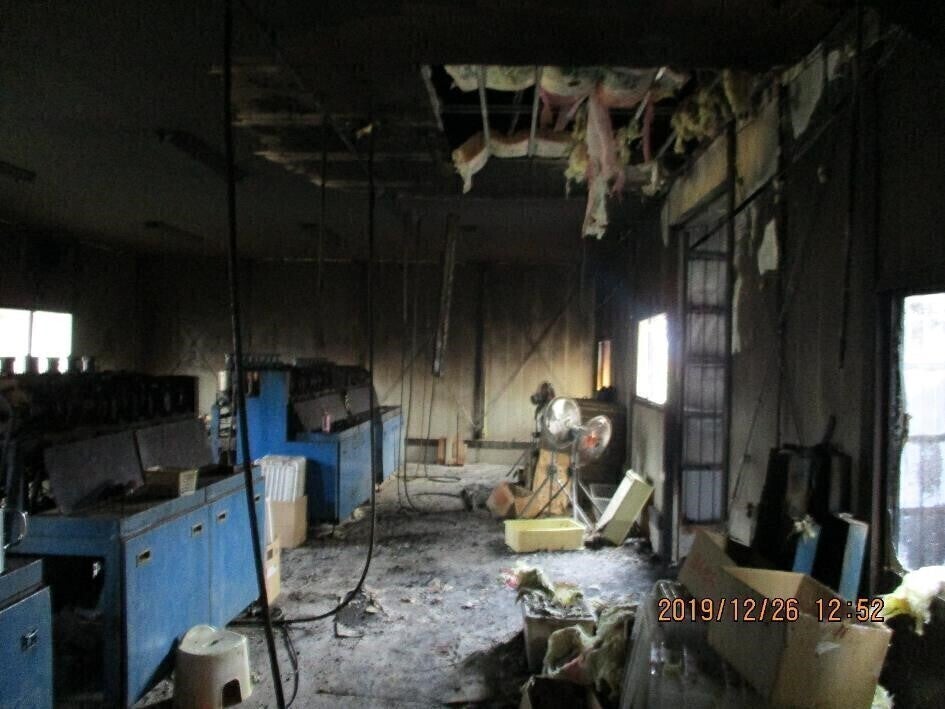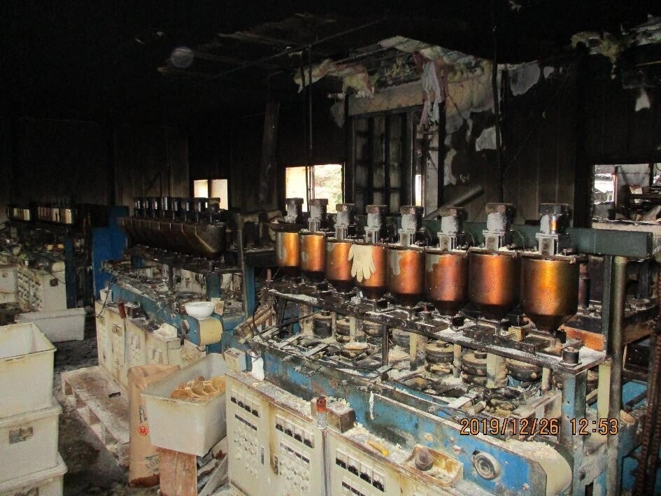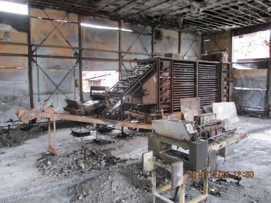 2019年12月に当社の工場が火事で焼失しました。火元の乾燥機が設置されていた第2工場は全焼、隣接する第1工場に類焼し「ぽんせん」の生地を焼く機械も半焼しました。