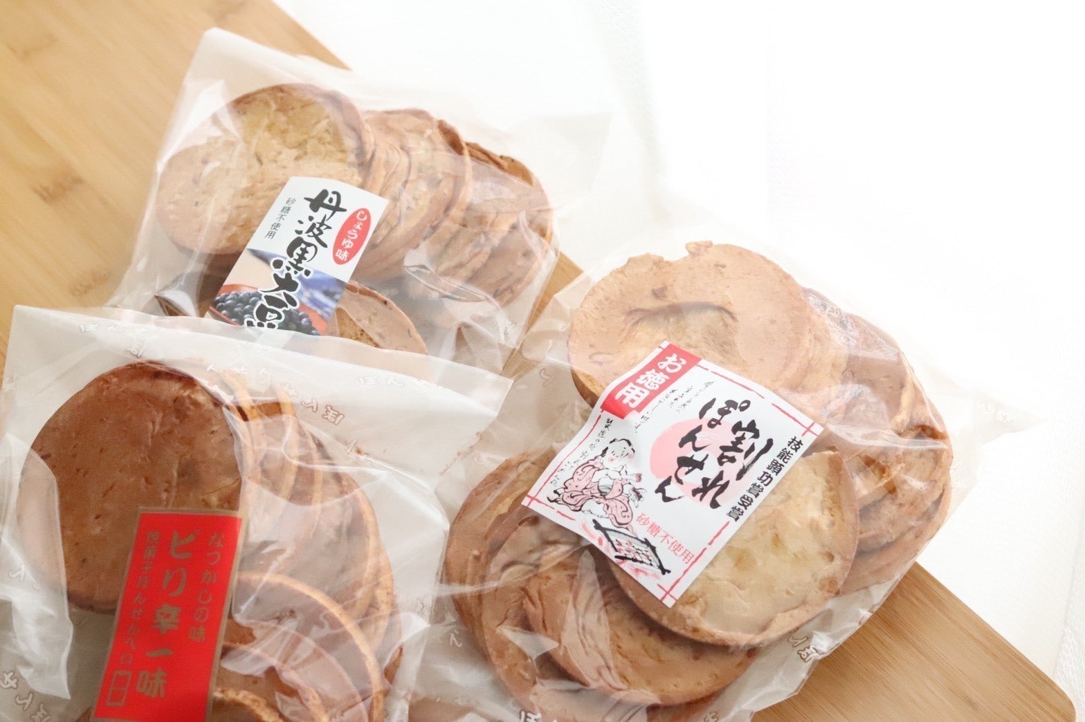 現在は、生産ラインの関係で、しょうゆ味・ピリ辛一味・丹波黒大豆の3種類の味付けのみ製造しています。