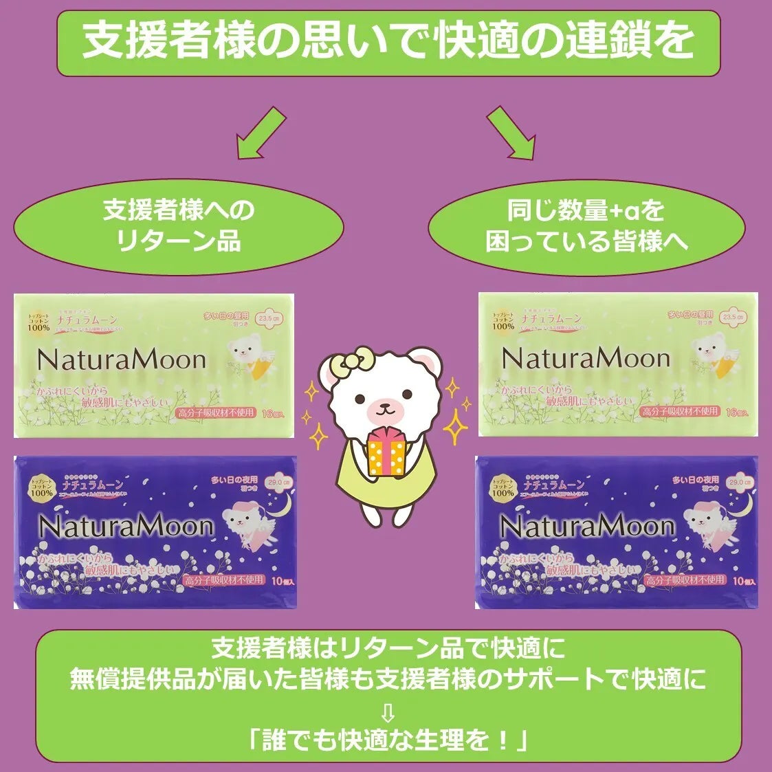 また、私共と致しましては「生理の貧困」は、世間で語られている生理用ナプキンの入手に苦労している方々だけではなく、毎回の生理を快適に過ごせていない方々も「生理格差」「生理の貧困」の対象者様と考えております。支援者の皆様に快適な生理用品をリターン品としてお送りする事も大きな取り組みの一つです。