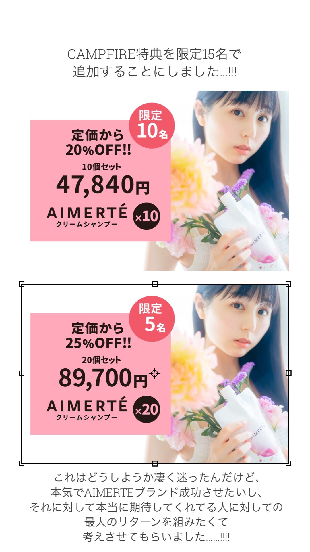 2021/12/04 16:11この度、本当に髪を綺麗にしたい方、AIMERTEブランドに心から期待してくれてる方向けのリターン追加を発表させて頂きました………!!!!!【追加1】①定価5,980円×10個入り=59,800円の20%オフ 47,840円 特典:1)くりえみと1対1のオンラインビデオ通話でシャンプーについてお話しできる権利あなたの髪のお悩み、AIMERTEブランドについて、全て一対一で丁寧に相談を聞きお答えさせて頂きます。 一人30分間 限定人数:10人【追加2】②定価5,980円×20個入り=119,600円の25%オフ 89,700円 特典:1)くりえみと会ってエメルテシャンプーについて直接お話ができる権利 2)共同開発者の美容師によるシャンプーデモを実施,上手い使用方法の説明(任意)場所未定、交通費自己負担 一人45分間 限定人数:5人これはどうしようか凄く迷ったんだけど、本気でAIMERTEブランド成功させたいし、それに対して本当に期待してくれてる人に対しての最大のリターンを組みたくて考えさせてもらいました……!!!!もろちんブランドブックにサイン、オンライン感謝祭への参加、諸々全てこちらのリターンの方には付いてきます♥︎複数リターン購入も可能です。!!本当にAIMERTEブランドを成功させたい。応援よろしくお願い申し上げます。!!絶対後悔させません。よろしくお願い申し上げます。!! もっと見る