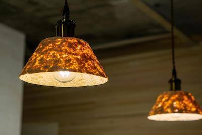 ※今回のプロジェクトで什器制作を依頼する工房「キクズノヒト」による、木屑をリサイクル活用した全く新しいランプシェードです。ぜひご支援くださいませー!