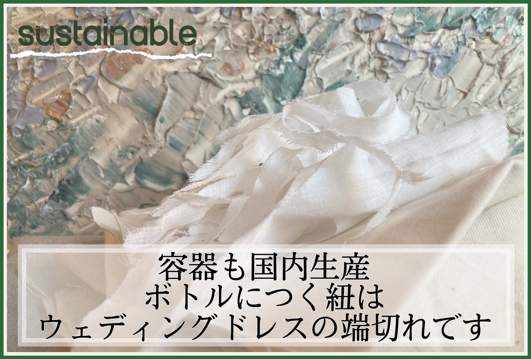 サスティナブルの観点から、リネンドレスの使わない端きれを私自身で裂き、一本一本ボトルに結んでいます。幸せな想いが詰まっている優しい肌触りのドレス。貴重な端きれを文字のごとく、幸せなご縁を結んで行けたらという願いがこもっています。全く同じものは一つとしてありません。どんな紐の姿かは、一本一本違います。手に取った方、それぞれが幸せになりますように。