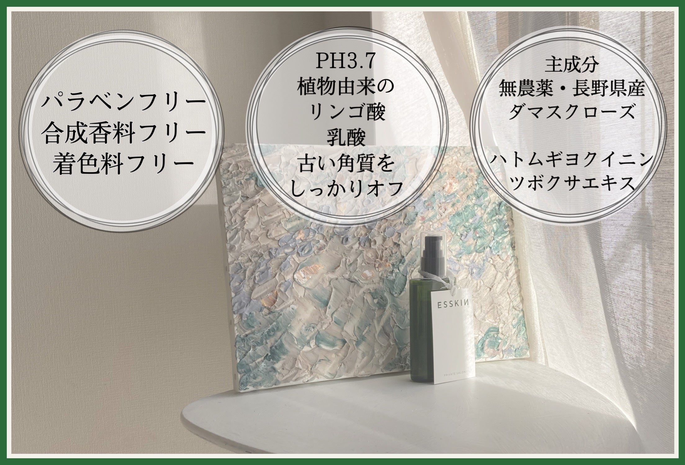 成分: ダマスクバラ花水、乳酸桿菌/セイヨウナシ発酵エキス(カンキン)、プロパンジオール、ペンチレングリコール、グルコン酸、乳酸、クエン酸、リンゴ酸、水、オランダビユ種子エキス、ツボクサエキス、コメ発酵液、BG、グリチルリチン酸2K、ヨクイニンエキス、パルミチン酸レチノール、ヒドロキシアセトフェノン、ダマスクバラ花油、ゼラニウム油、カナリアノキ樹脂油