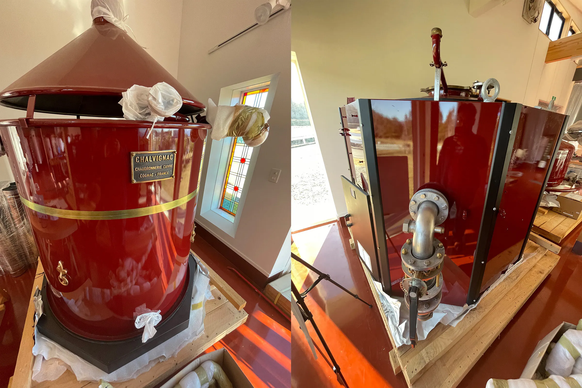 蒸留器自体は輸入出来ましたが、直後にコロナウイルスの影響により、海外から蒸留器組み立ての技師が入国出来ず、今現在も見通しが立っていない状況です。