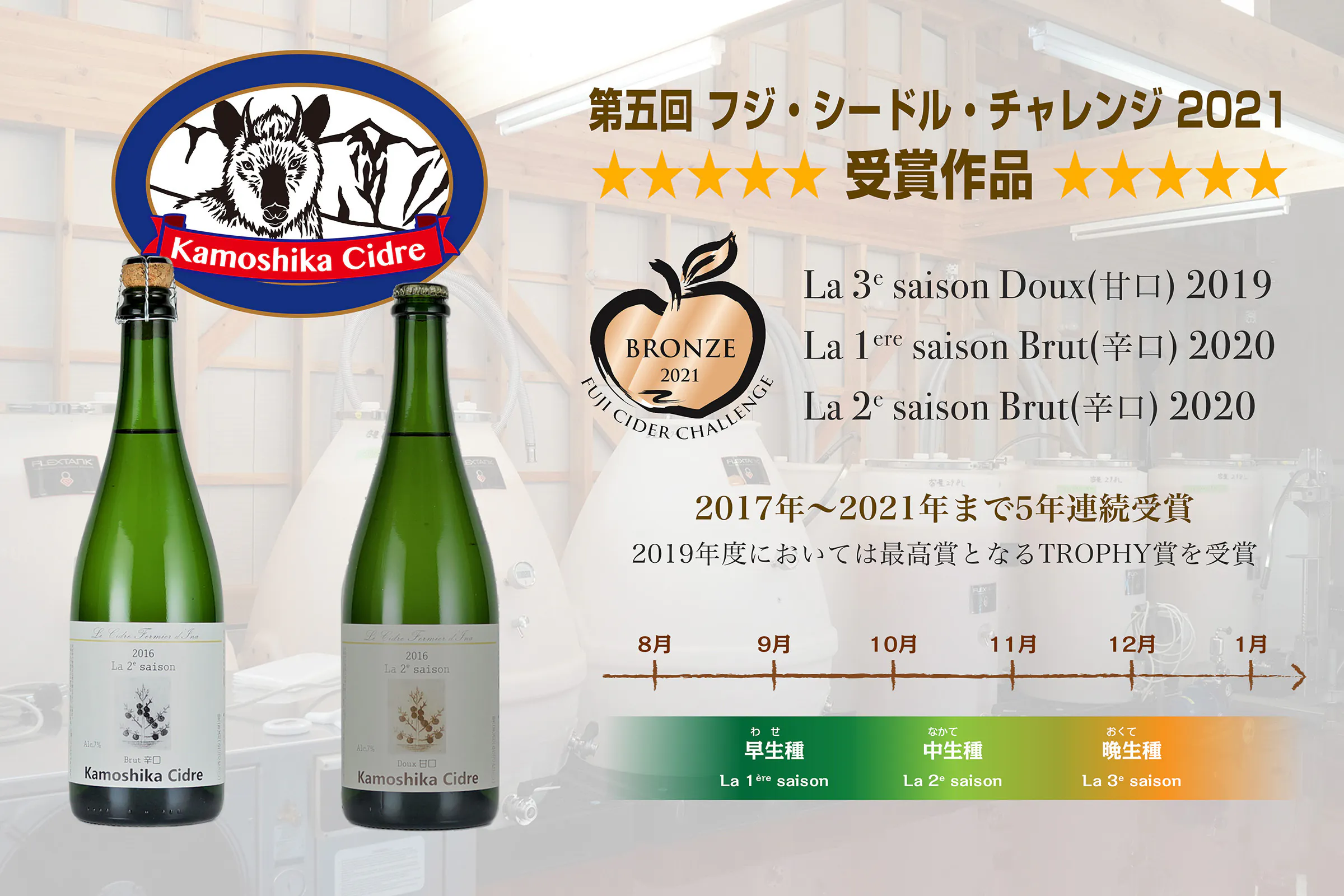 カモシカシードル醸造所ではリンゴの収穫時期(saison [セゾン])によって3回に分けてシードルを仕込んでいます。それぞれのセゾンによる風味の違いをぜひお試しください。