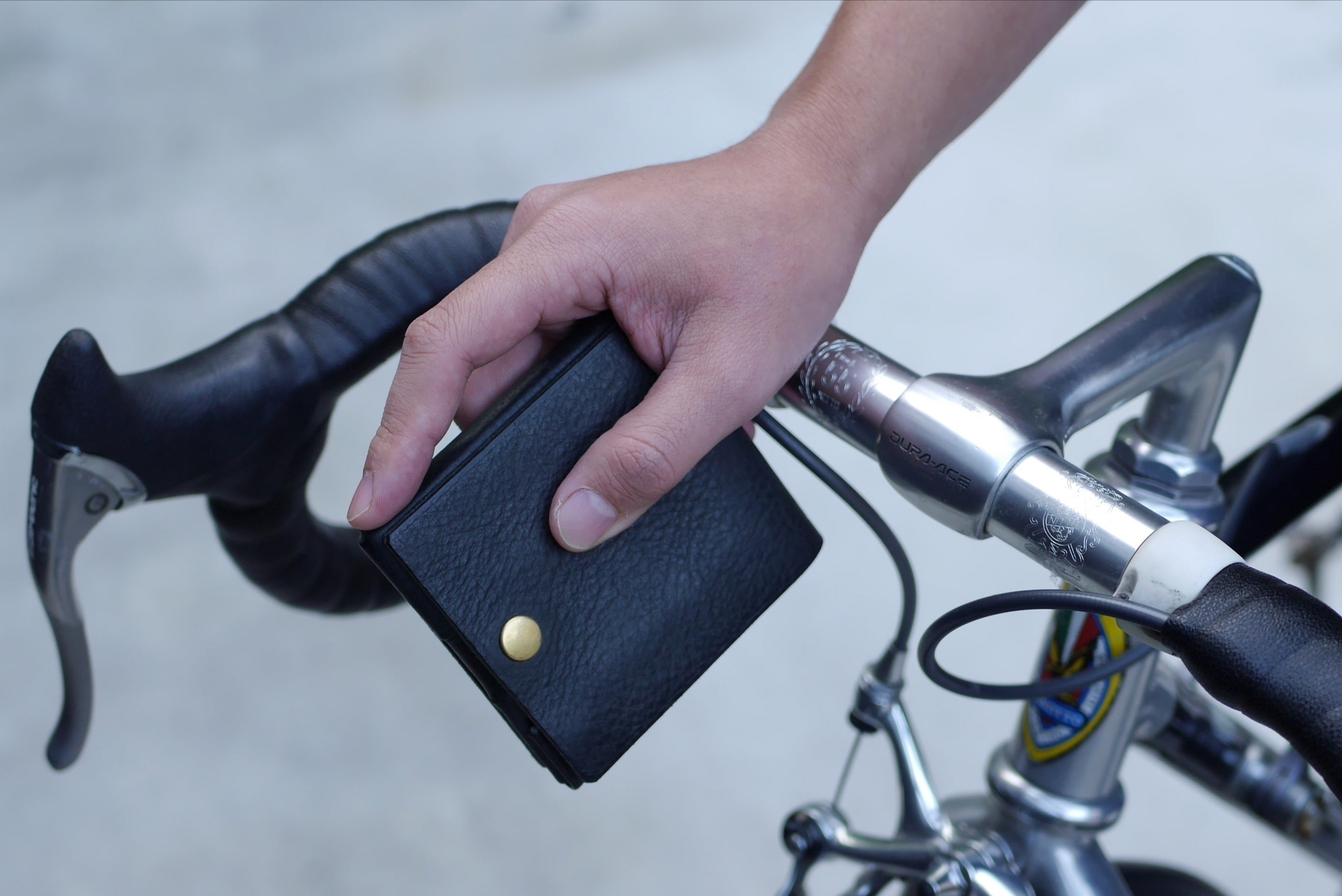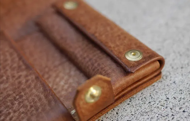 わずか0.9mmという極薄革を通常の約2倍の量使用し、折り紙の要領で内側に折り貼り合わせる事で、1.8mm厚とは思えぬ強靭さと、使い勝手を損なわないしなやかさを実現!縫製などを省くことで製作工程を短縮し、お値段を抑えることに成功しました。