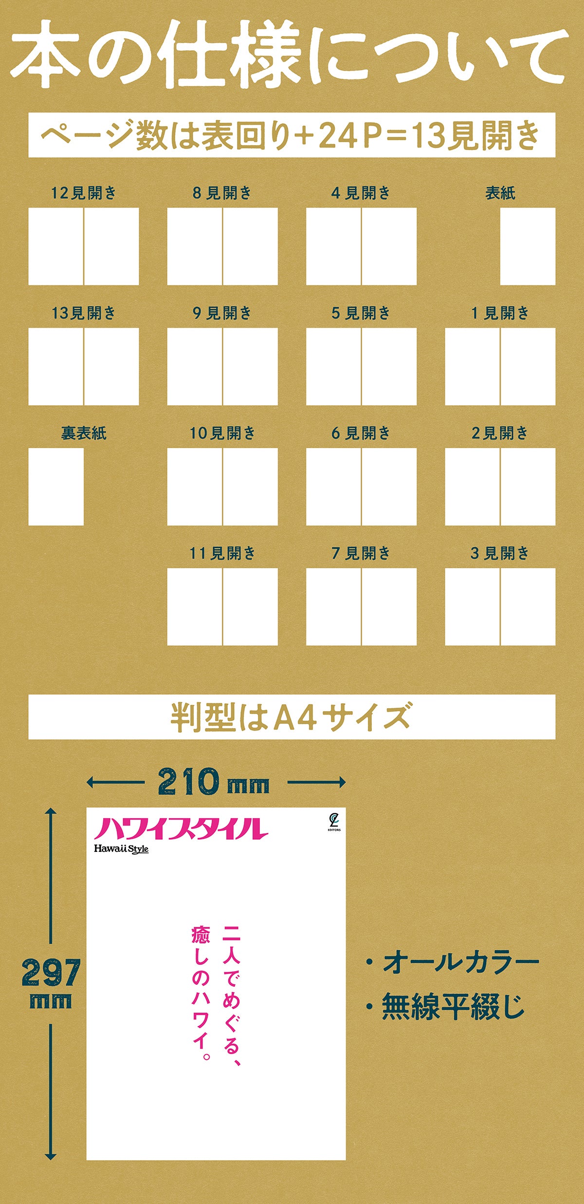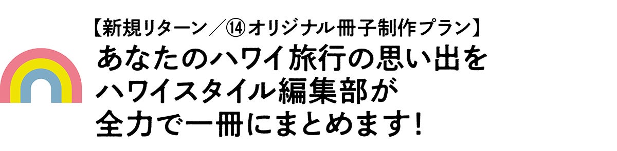 あなたが過ごしたハワイの思い出は、唯一無二のかけがえのない体験です。そんな大切な記憶をハワイスタイル編集部が細やかに拾い上げ、ていねいに紡ぎ、ハワイスタイルの誌面のような一冊にまとめます。主役はもちろんあなたです。タイトル(「ハワイスタイル」ロゴでも可能です)、メインキャッチ、コンテンツもすべてあなたの体験をもとに作成します。ページをめくるたびに楽しかった思い出が美しく蘇り、心を揺さぶる一冊となるに違いありません。