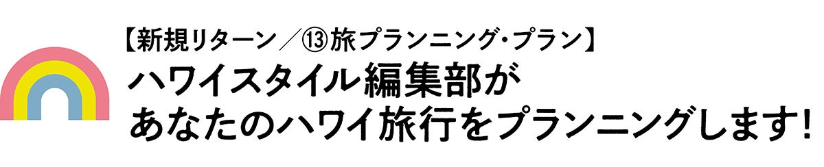 コロナ禍となる前は年間でハワイ専門誌「ハワイスタイル」を4冊、「ハワイ本」をはじめとするガイドブックを3~4冊発行してきたハワイスタイル編集部が、あなたのためのハワイ滞在のプランニングをお手伝いします! いつ行けるともわからないご時世ですが、その日が訪れた時、余すことなくハワイを遊びつくすために、ハワイスタイル編集部と一緒に楽しくプランを練りましょう! どんなハワイ滞在にしたいのか、お好みやご希望を伺ったうえで、時には現地コーディネーターやハワイ業界の方々など、我々のハワイネットワークを駆使して最高のハワイをプランニングします。