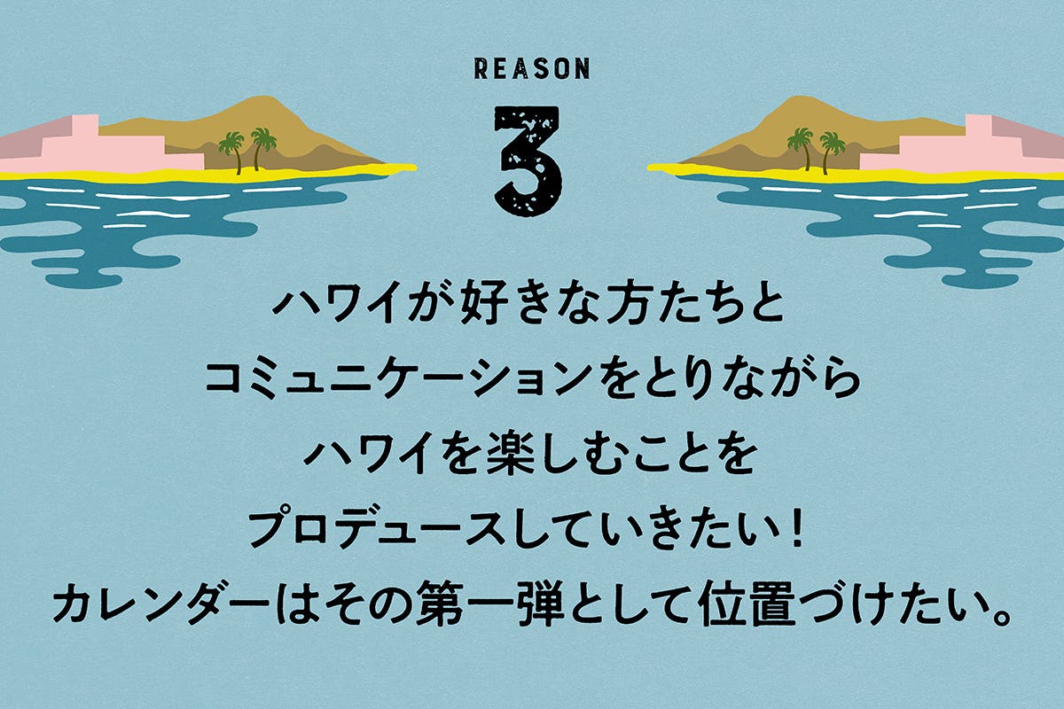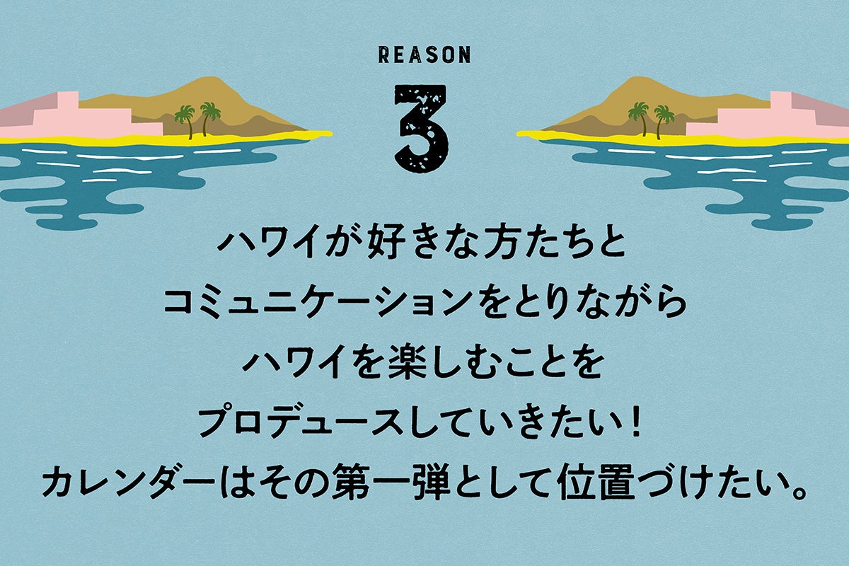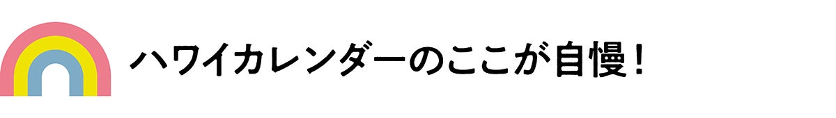 このカレンダーはその第一弾。「ハワイをもっと楽しむプロジェクト」として、みんなの声を取り入れながら、ハワイ気分を盛り上げていく企画をドシドシ立ち上げていきたいと考えています。ハワイに行きたくて仕方がない、ハワイをもっと楽しみたいという方は、ハワイスタイルの今後の取り組みにも、ぜひご注目ください!