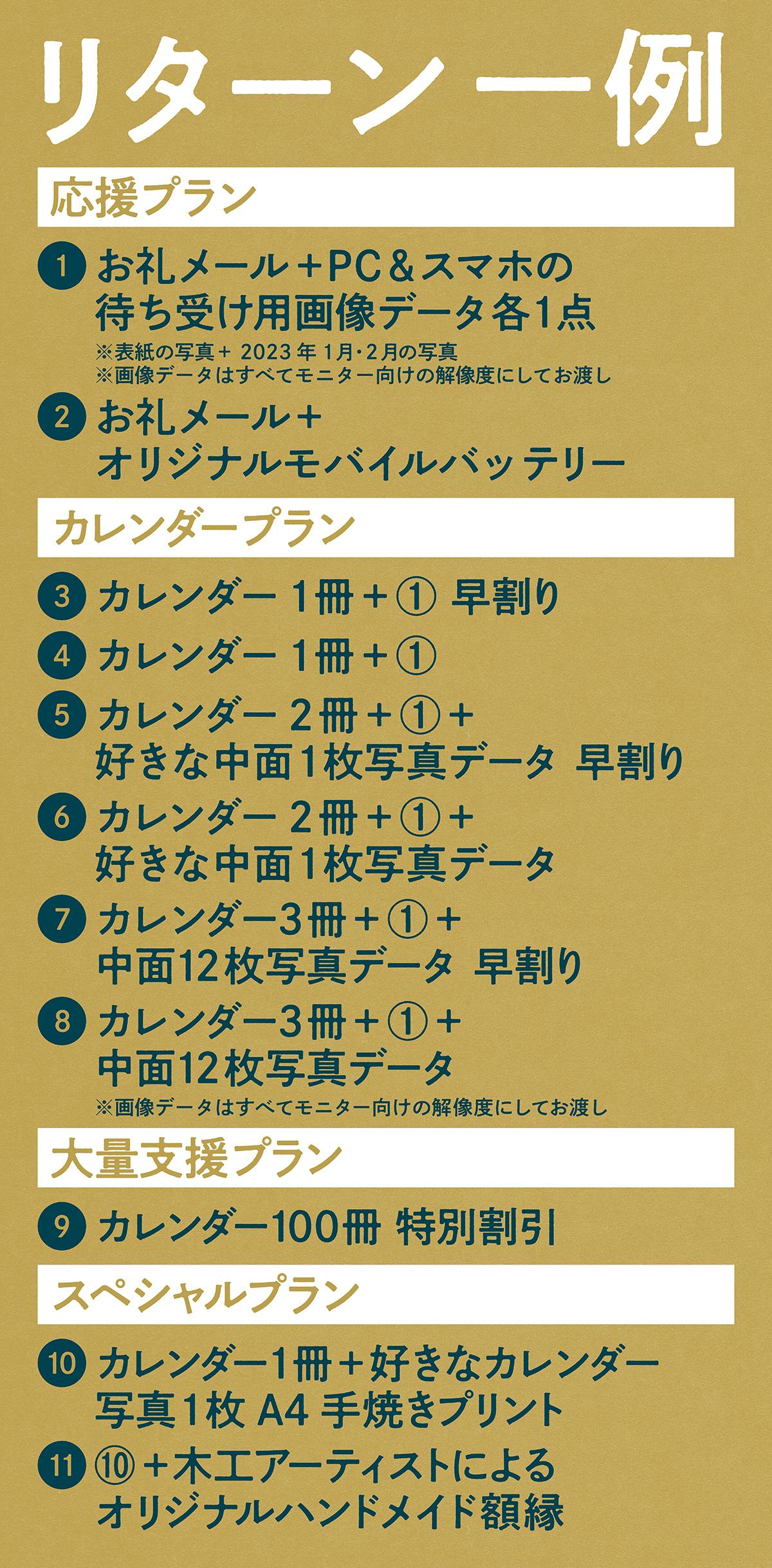 応援プランのお礼メールと、カレンダー応援プランを選んでいただいた方には、リターンとして表紙と2023年1月・2月に掲載している写真データをお礼メールとともにお送りします。PC&スマホの待ち受け画像として、どうぞご利用ください!