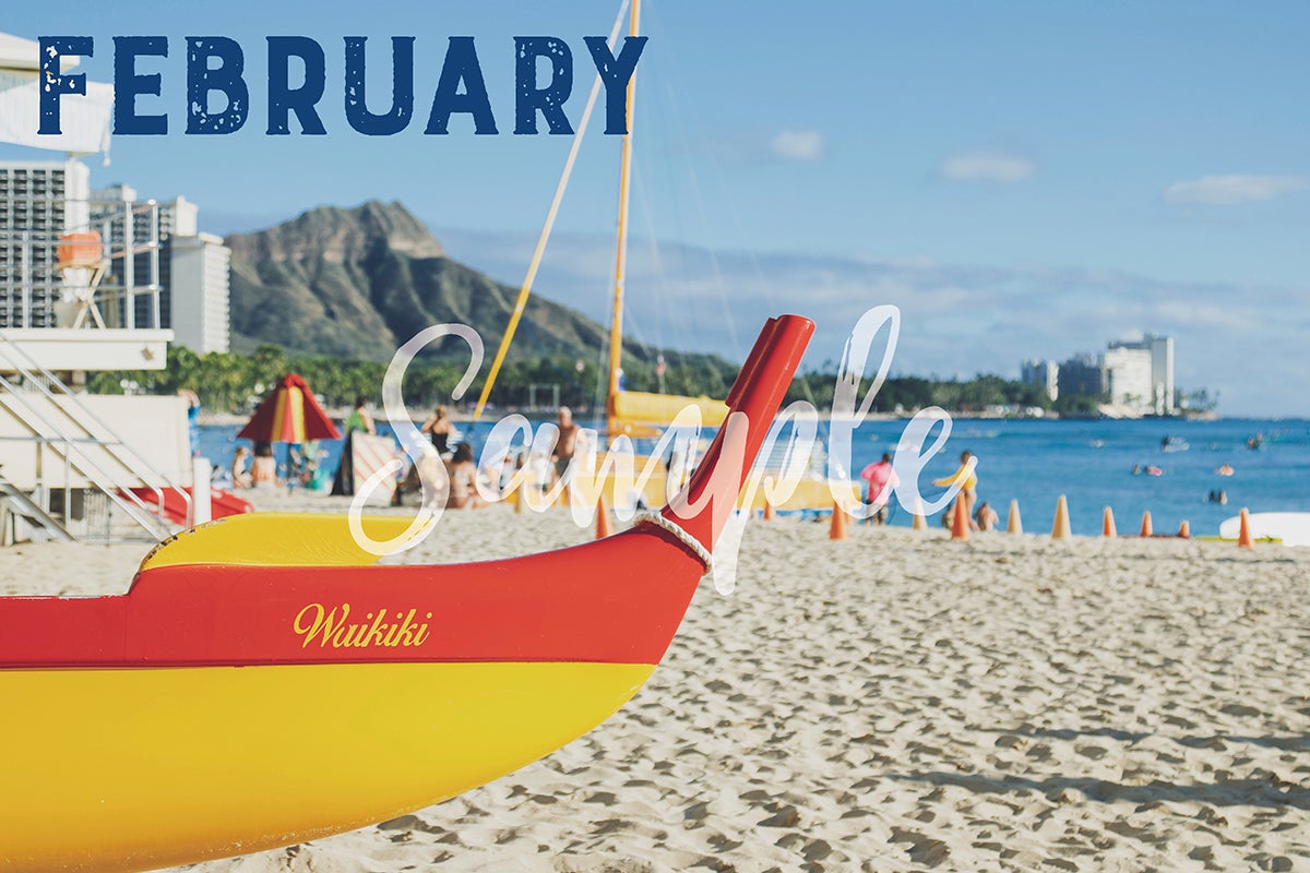 【2月】ワイキキビーチ。ハワイの象徴ともいえるアウトリガーカヌーには‶Waikiki”の文字が