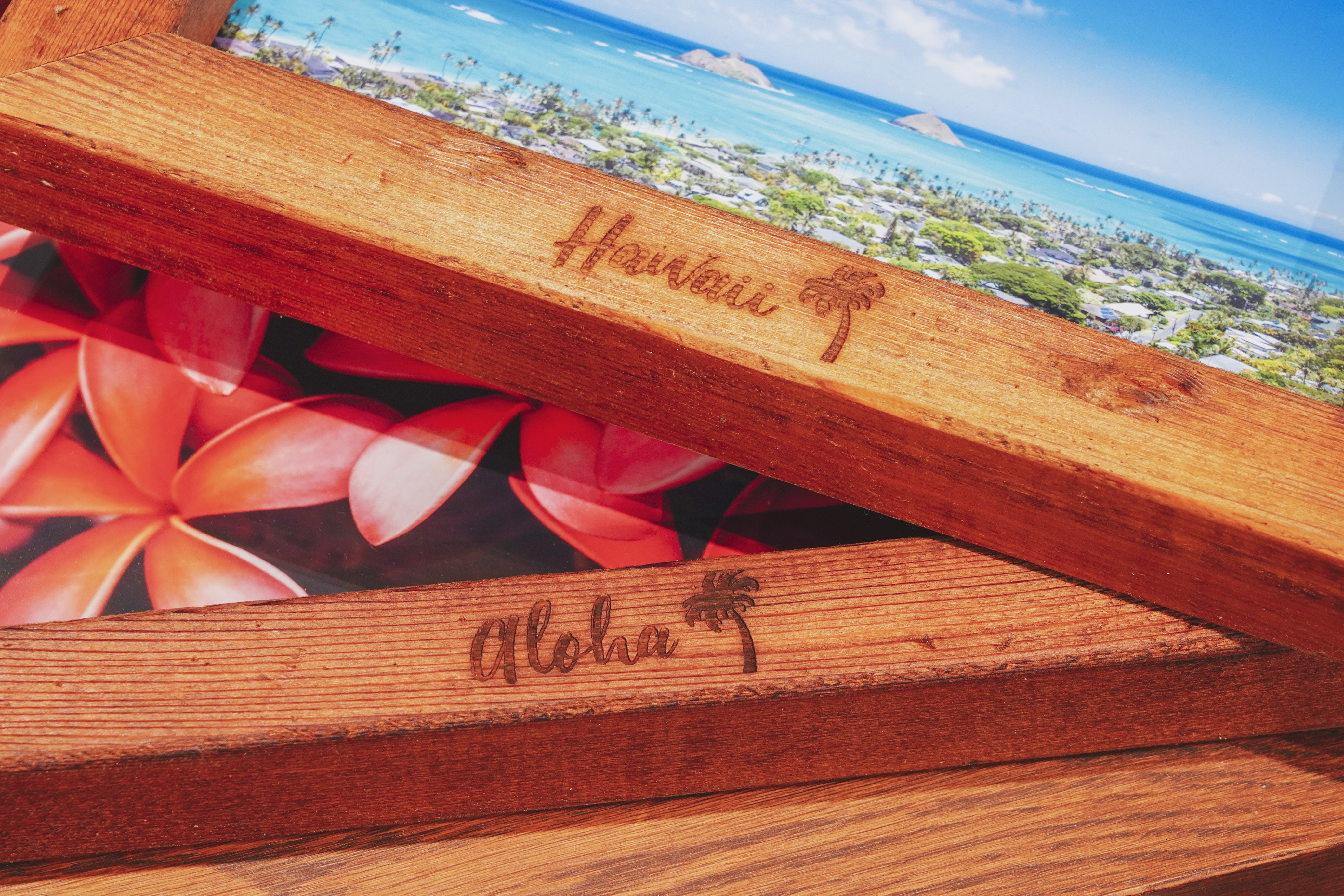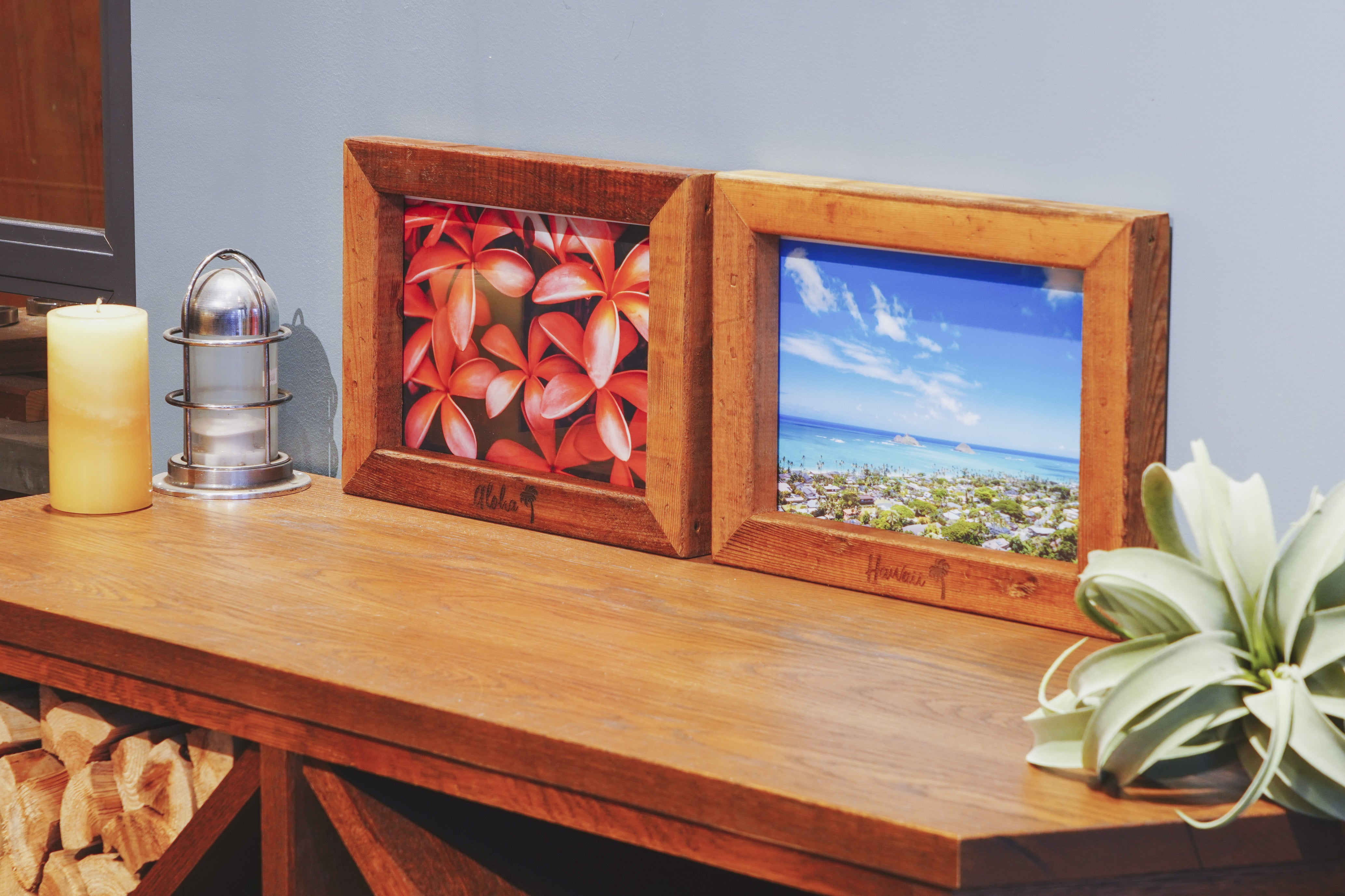 木工作家・村山じゅん氏による廃材を使ったフォトフレーム。ハワイの風景写真がインテリアに
