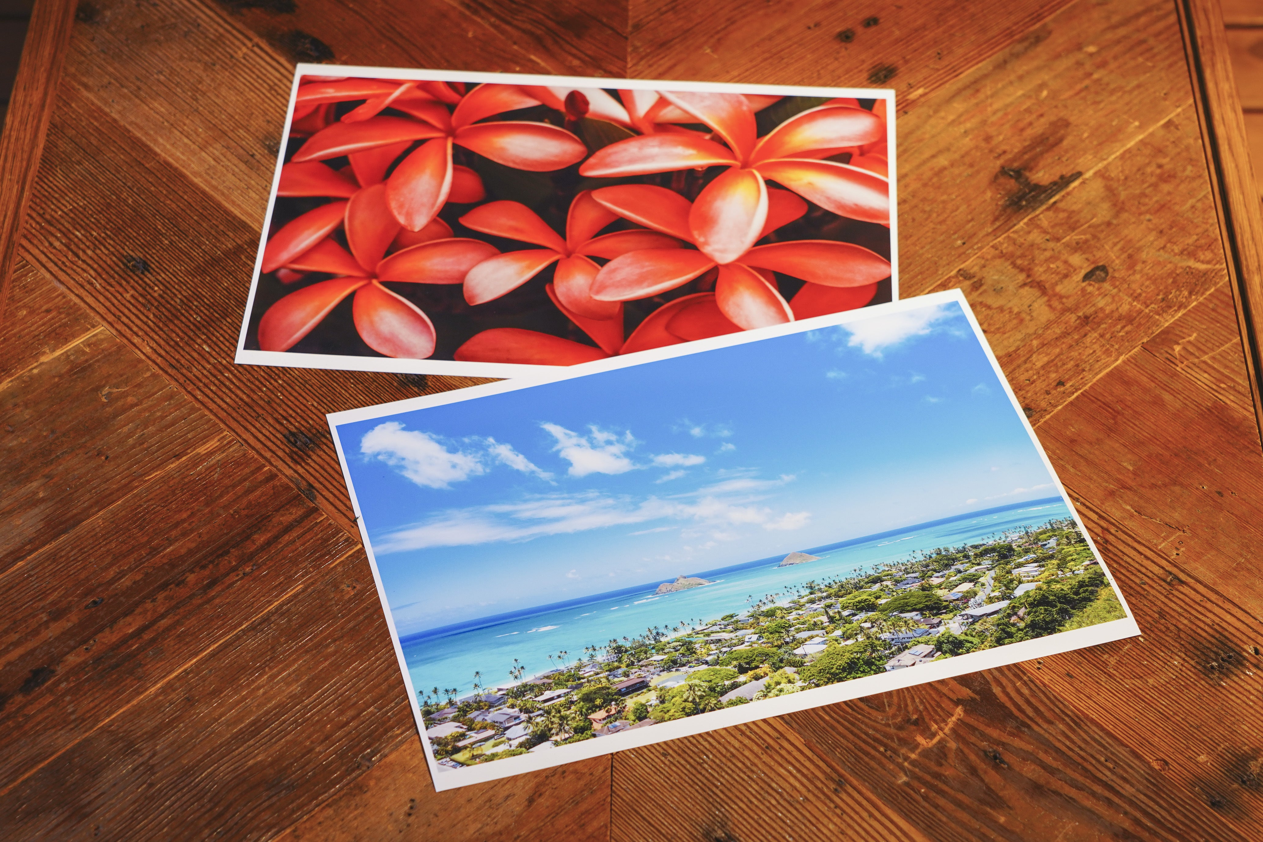 まるで窓からハワイの風景を見ているようなデザインにこだわった、大判サイズの壁掛け仕様になっています。その分、ポスト投函ができずに送料が割高になってしまいましたが、部屋に飾った際に、美しい写真がしっかり見えてほしい故、何卒ご容赦ください。