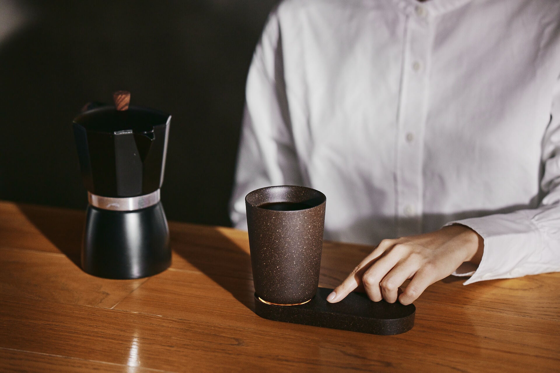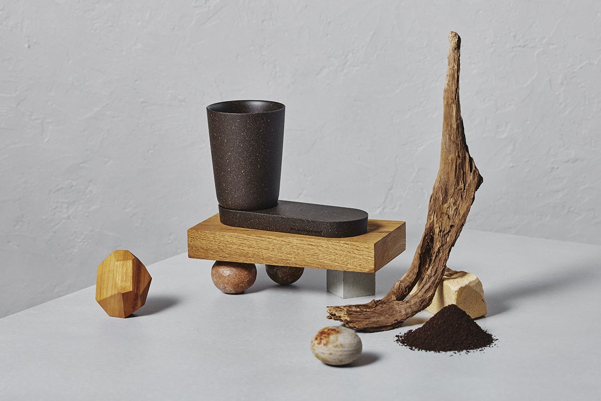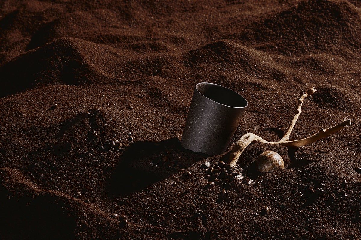 使用済みの豆殻を練り込んだ素材で作られたカップは、手触りでもコーヒーを感じられるテクスチャーに。
