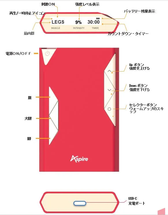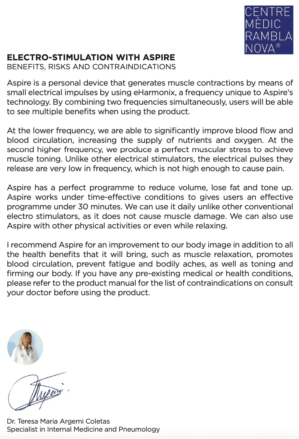 Aspire(アスパイア)は、シンガポールに拠点を置くAlpha Bodytec社が開発した、下半身の引き締めに使える、EMS技術を採用したフィットネスパンツです。最新の独自技術により、人間工学に基づき個々の身体にフィットするよう設計されています。Aspireは、EMS技術により筋繊維を刺激し筋肉を引き締めて、血行を良くすることができます。Aspireの選択モードでは、年齢、性別体力に合わせて強さの調整が可能です。