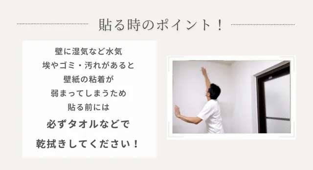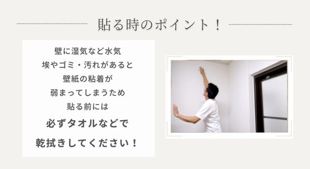 ● 接着性:通常の使用方法であれば5年ぐらいは問題なく使用できますが、壁面の状況によってはうまく張り付かなかったり、十分な接着強度がでないこともあります。貼り付け前に施工面が平らであるかを確認し、壁面(貼り付ける対象の表面の汚れ)をきれいにふき取り、十分に乾燥させてからの作業をお勧めします。