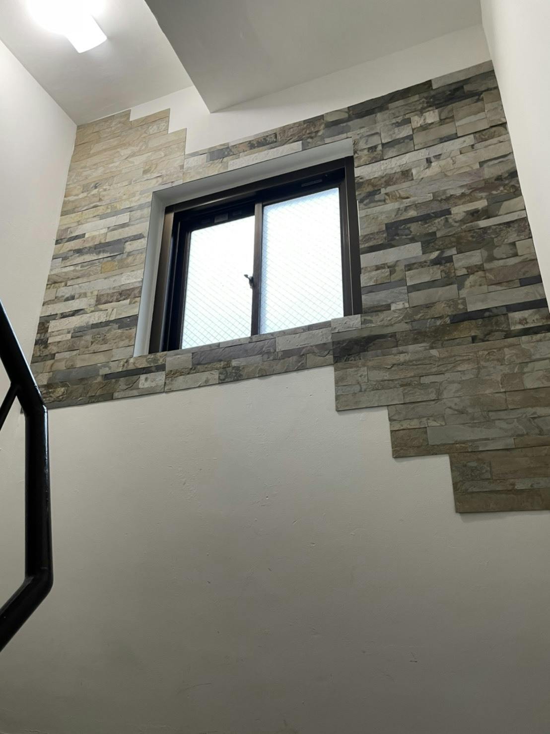 全面貼りでなくあえて部分使いにしましたが、野性的で、かなり見栄えがする仕上がりとなりました。(不器用な)大人1人で約2時間のDIYでした。(笑)