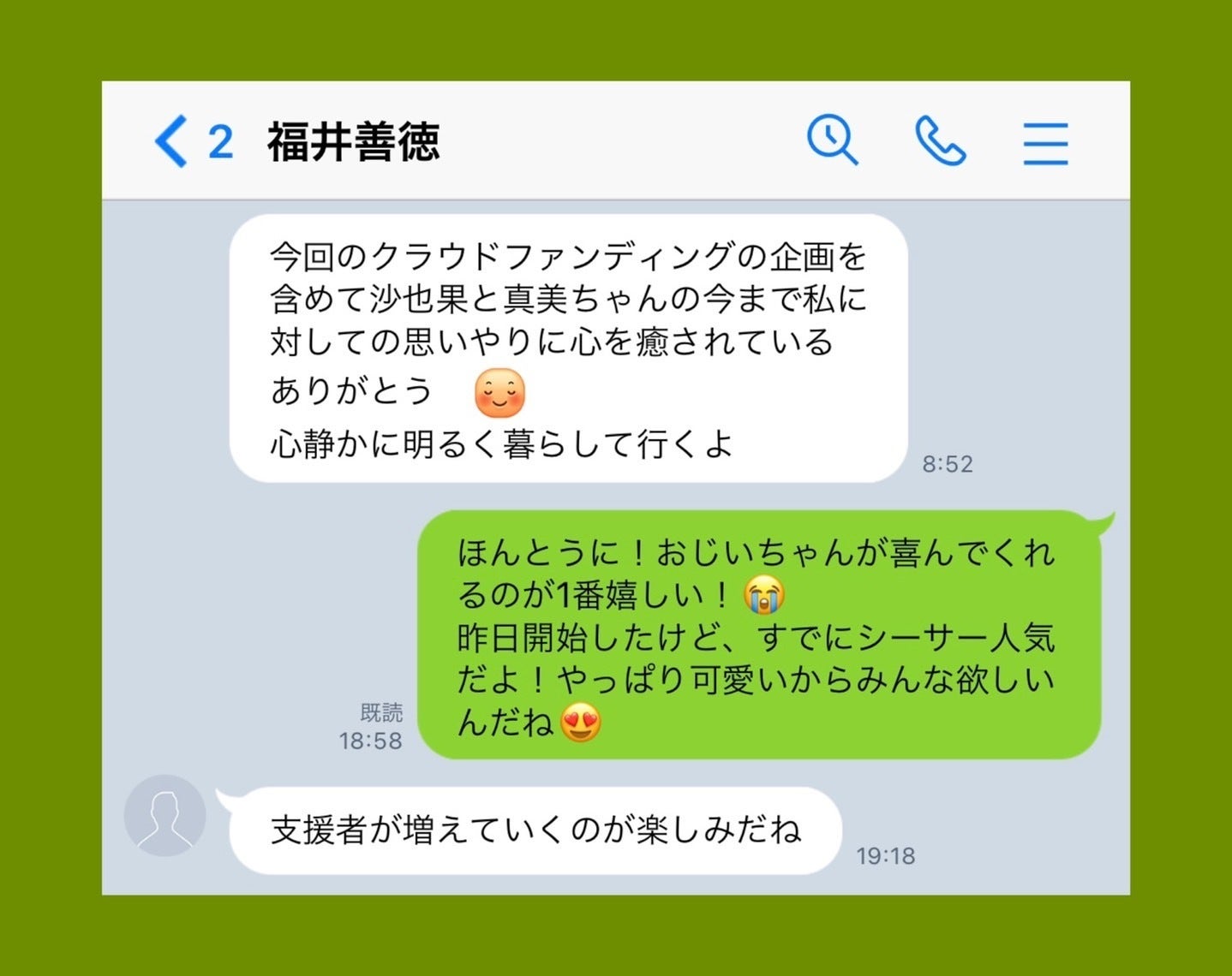 祖父は私以上に毎日進捗をチェックしてくれて、「今日も応援してくれる人が増えたね」と連絡をくれます。ご支援いただいた皆様のコメントのひとつひとつが、祖父の励みになっているようです。
