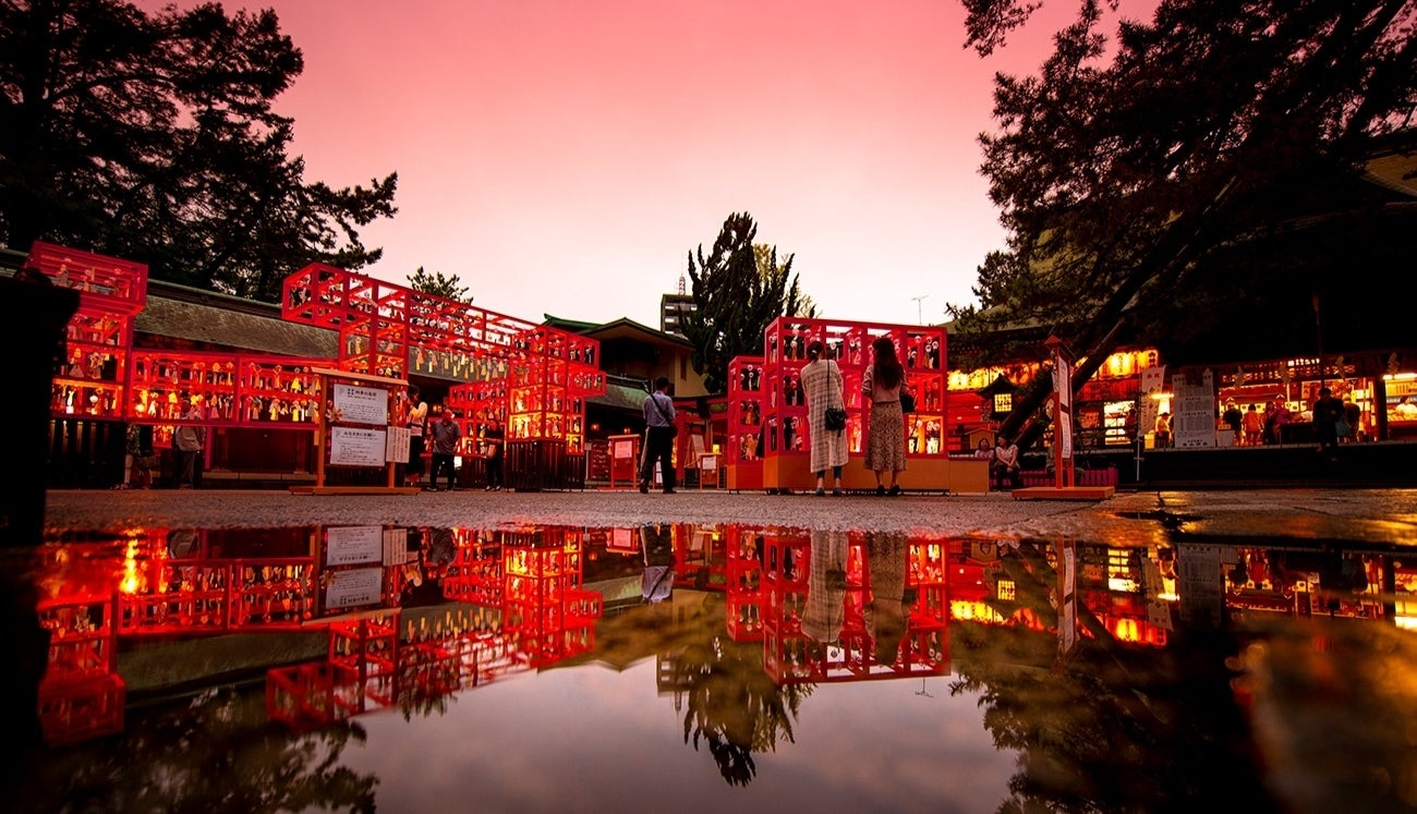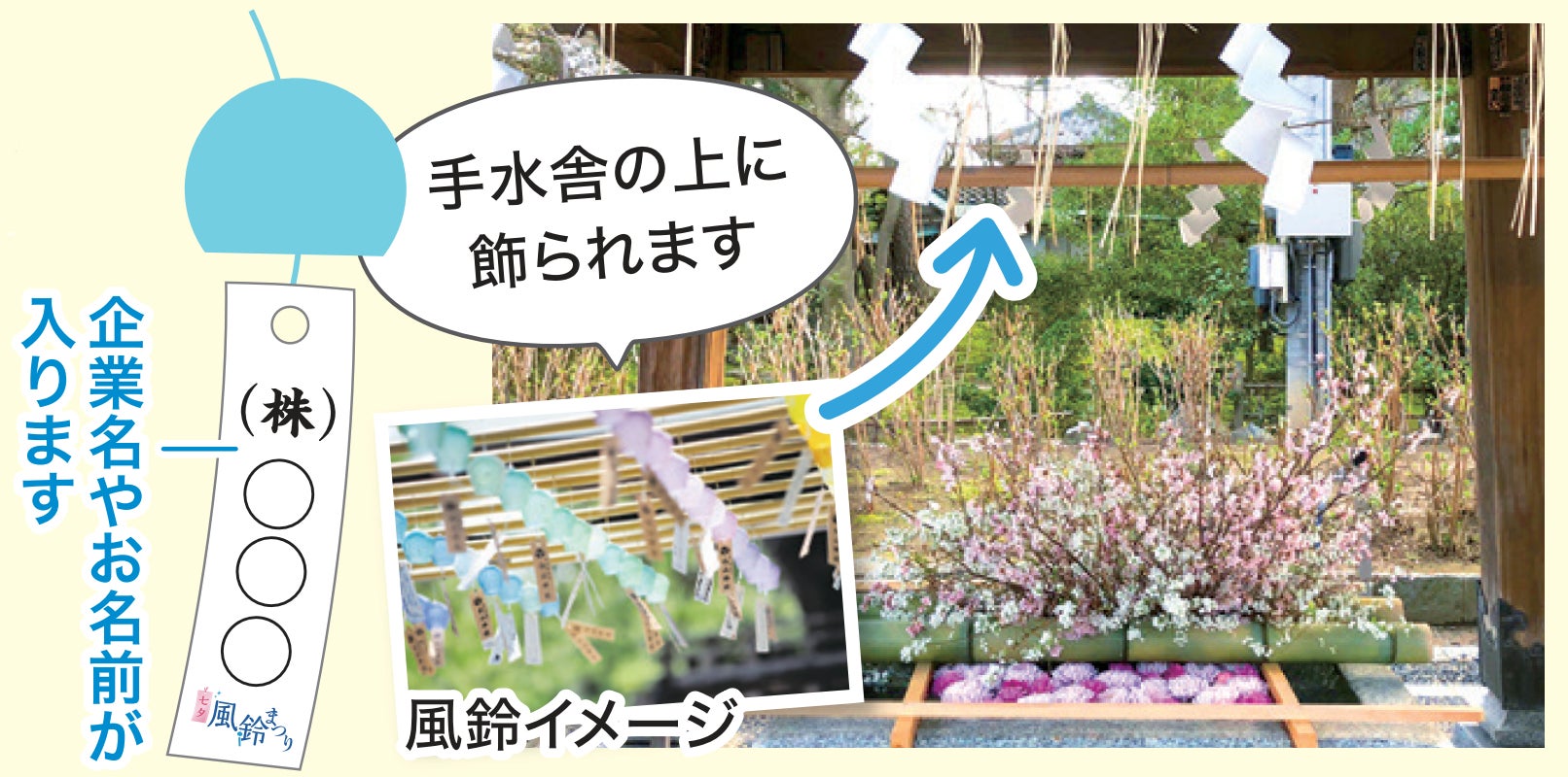 ご支援いただいた方のお名前(企業名・個人名)を短冊に墨書きし、境内入口の随神門の手前にある「花手水」上の風鈴に七夕風鈴まつりの期間中、飾らせていただきます。また、お祭り終了後のおはらいの際に、お名前を読み上げさせていただきます。