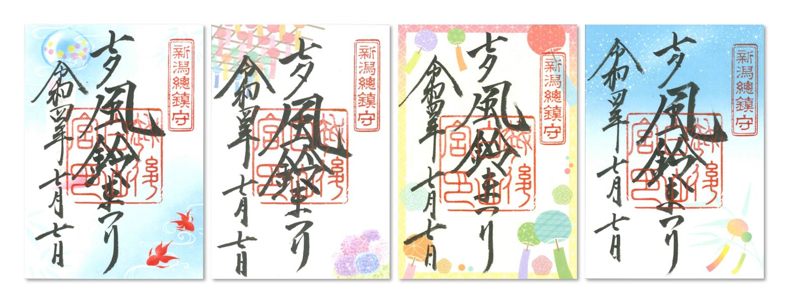 七夕風鈴まつりをイメージした4種類の限定御朱印をご用意しました。どの台紙も「水玉柄」が薄くおうとつで散りばめられ、透かしを通じて和の風合いを楽しんでいただけます。いずれも白山神社にて1枚1枚墨書きをしてお送りいたします。