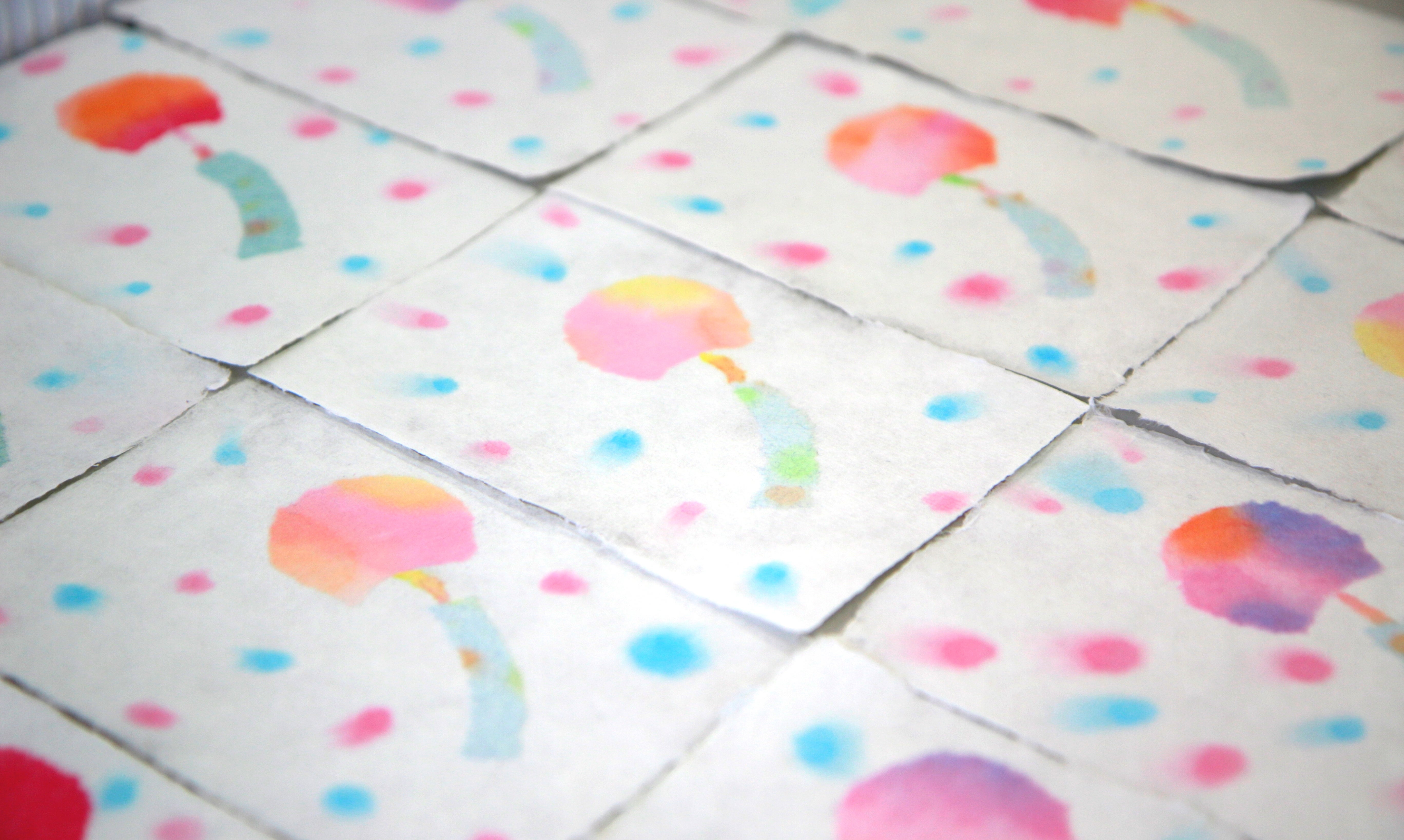 福祉施設の皆さんによる、ちぎり絵仕立ての手作り御朱印。地域の方々より寄付していただいた牛乳パックを、切る・煮る・剥ぐ・混ぜる等、たくさんの工程を経て、繊維状まで戻してから「すいて」台紙を作ります。その後に色付けなど、皆さんが出来るパートを責任もって取組み、同じデザインにはならない全てが1点物の手作り御朱印の台紙が出来上がります。そこに白山神社で墨書きをしてご支援者様へお届けさせていただきます。
