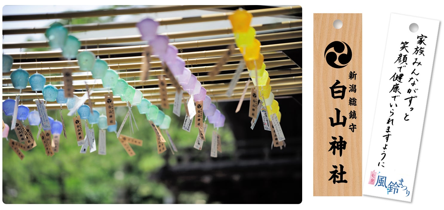 霊峰白山の開山1300年を記念して始まった祭事。古来より鈴の音は心身を清め邪気を祓う力があると言われています。新潟総鎮守 白山神社の七夕風鈴まつりは、境内に、集められた1000個以上の風鈴を吊るし、その音色で、厄を祓い、願いが風に乗って、神様に伝わりますようにとの願いを込めて。毎年、神社を彩る風物詩であるとともに、地域の人々や子どもたち、親子が絆を深め、郷土愛を育み、さらには思いを短冊に描き、祈る大切なお祭りです。お祭り終了後には、短冊のおはらいをし、みなさんのお願いが叶うよう大安吉日に祈願を致します。