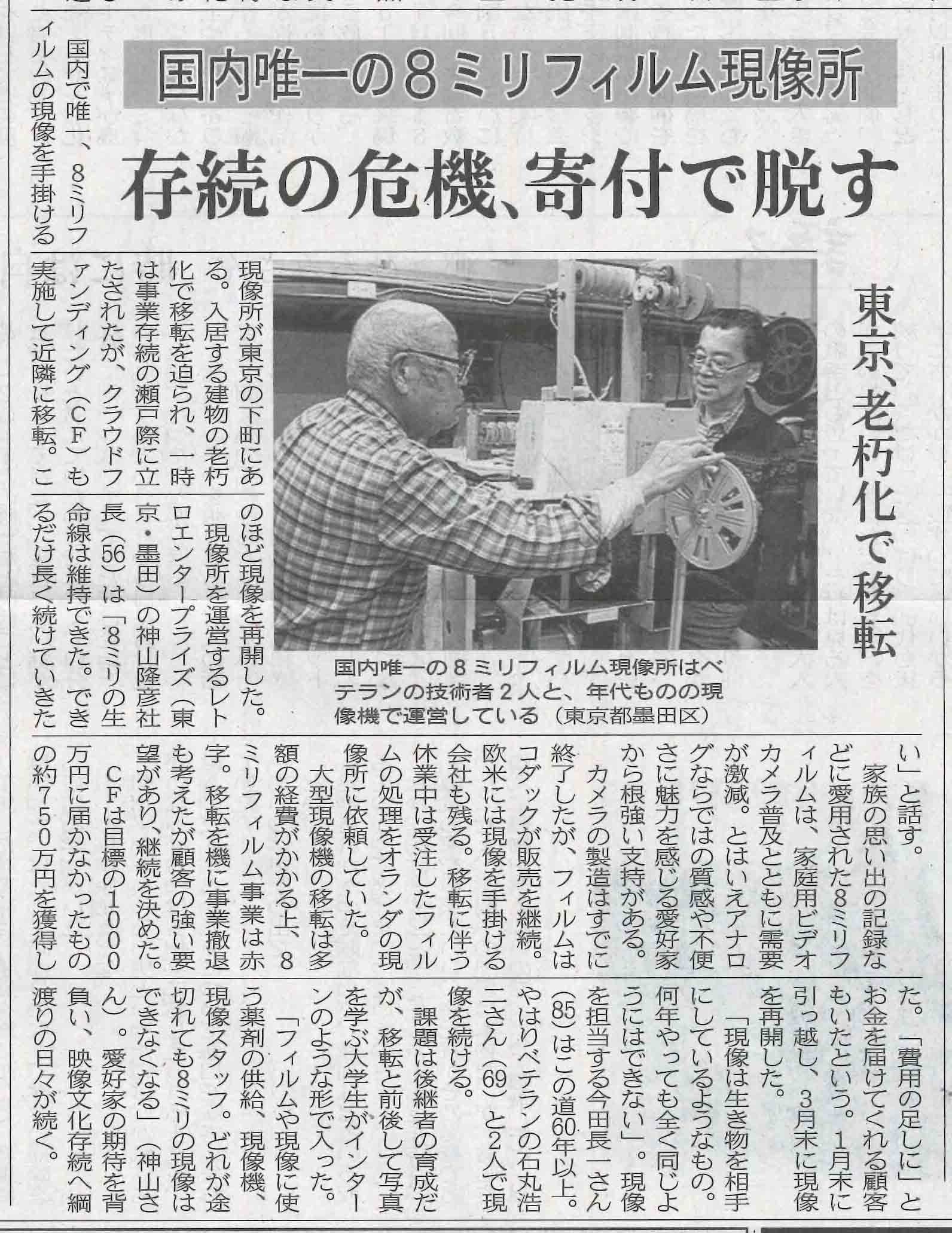みなさまのご支援が存続の危機を救い、現像施設の無事移転を果たしました。その模様を日経新聞さんが早い時期から取材され、映像と文章で残してくださいました。本日(4/25)の日経新聞夕刊にも、その記事が載りました。あらためまして、皆様にご支援の感謝を申し上げます。レトロエンタープライズ代表取締役 神山隆彦