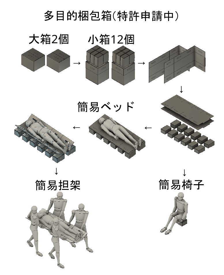 大箱は、展開すると「簡易担架」「簡易ベッド」「簡易ベンチ」になる段ボール箱です。