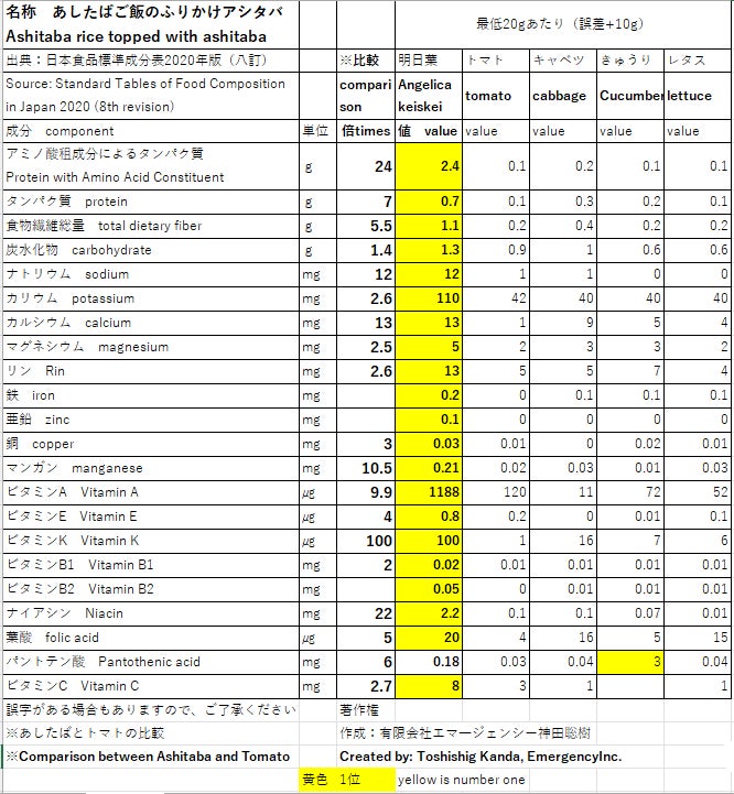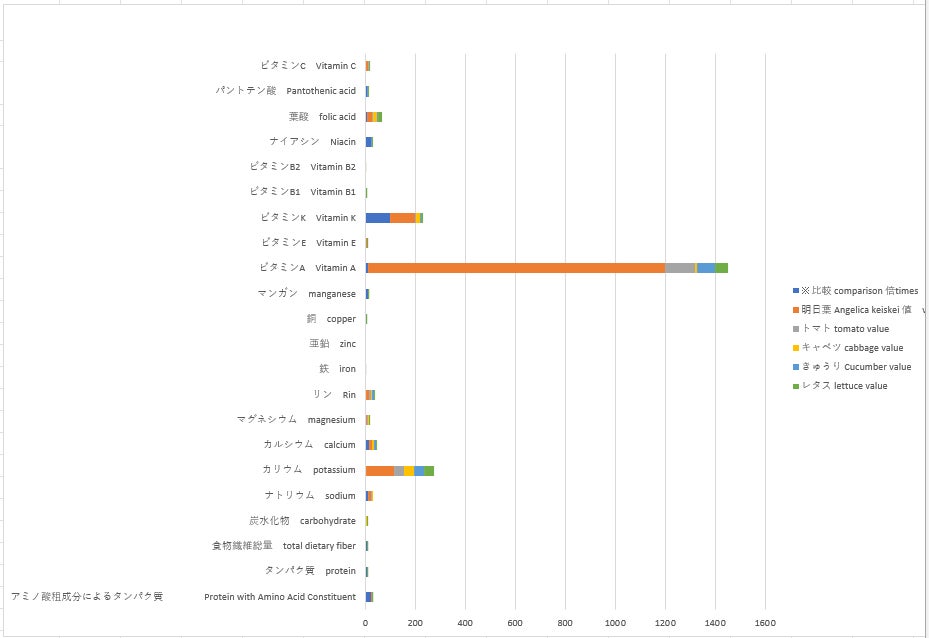 例えば、アシタバとトマトとの比較では、アミノ酸が24倍、食物繊維が5.5倍、ナトリウム12倍、カリウム2.6倍、カルシム13倍、ビタミンA9.9倍、ビタミンE4倍、ビタミンK100倍、ビタミンC2.7倍 等もあるんです。