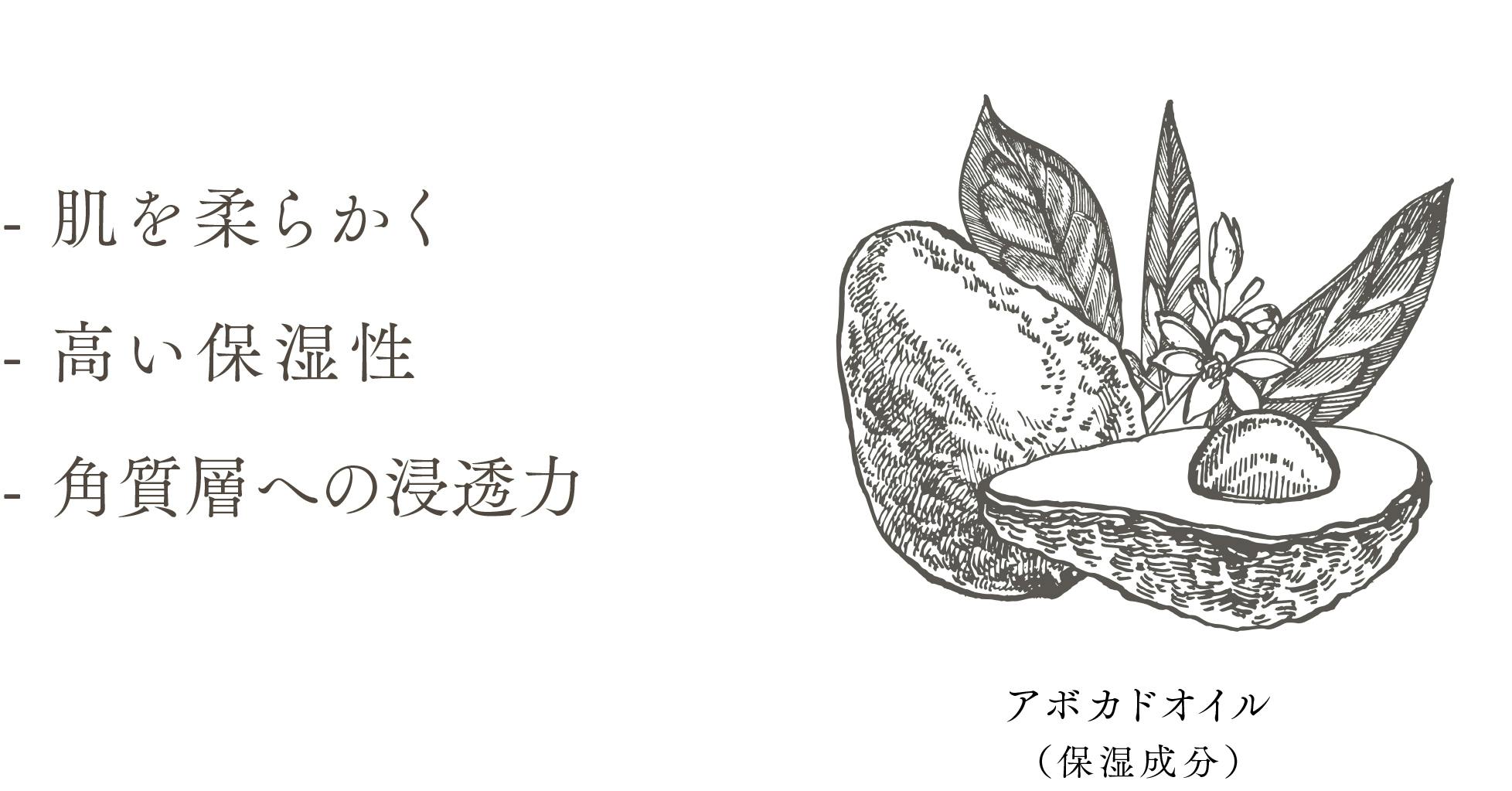 ブレンドしている「アボカドオイル」は、肌を柔らかくする作用に優れ、保湿力が高いのが特徴です。乾燥肌や成熟肌に向いており、角質層への浸透にすぐれています。
