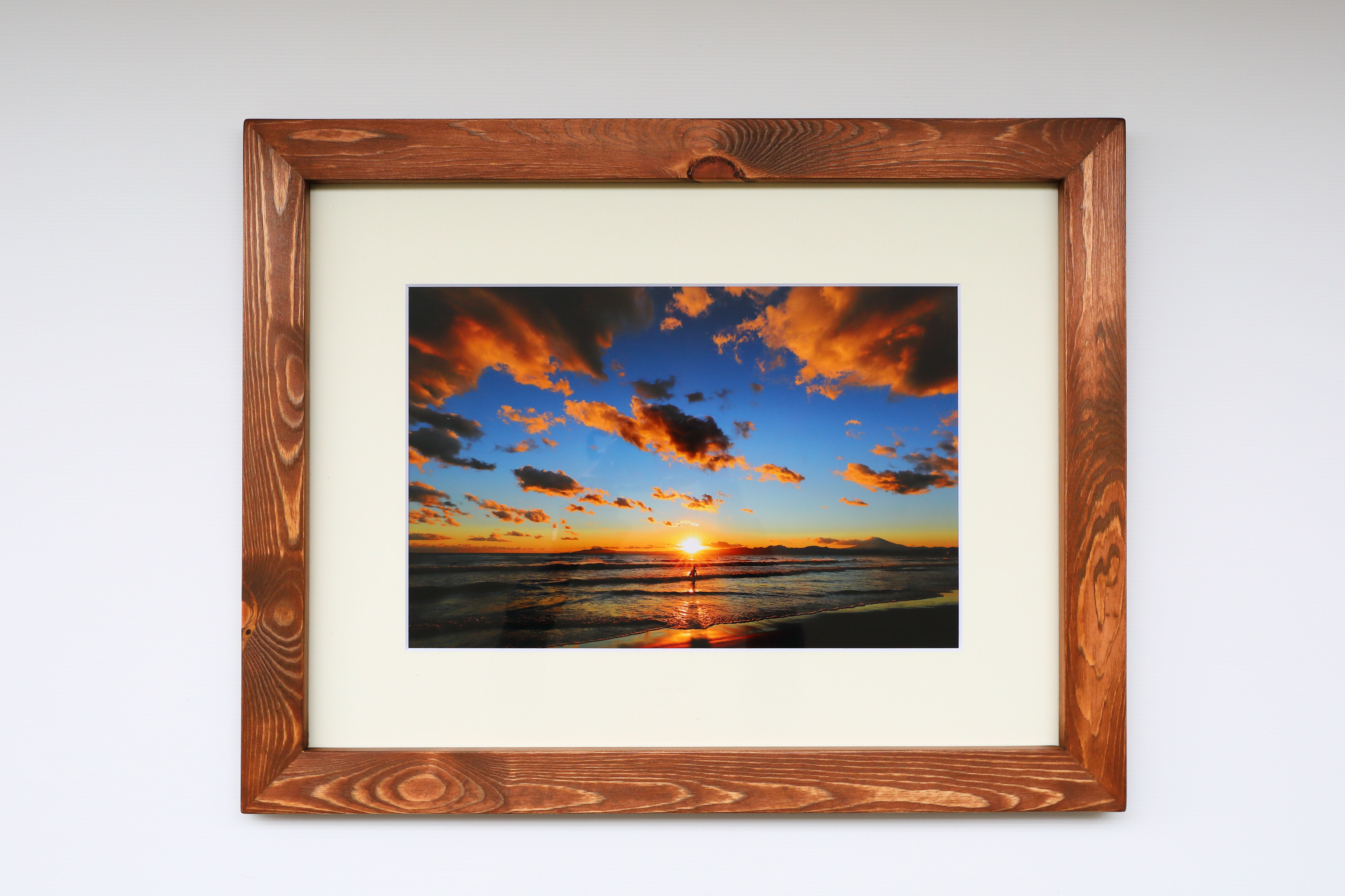 額装セットプランでは、湘南のティキアーティスト、ハンセン神谷氏によるハンドメイドの額を採用。高級感あふれる仕様でどんな空間にも映えます。(サイズ約685㎜×540㎜)