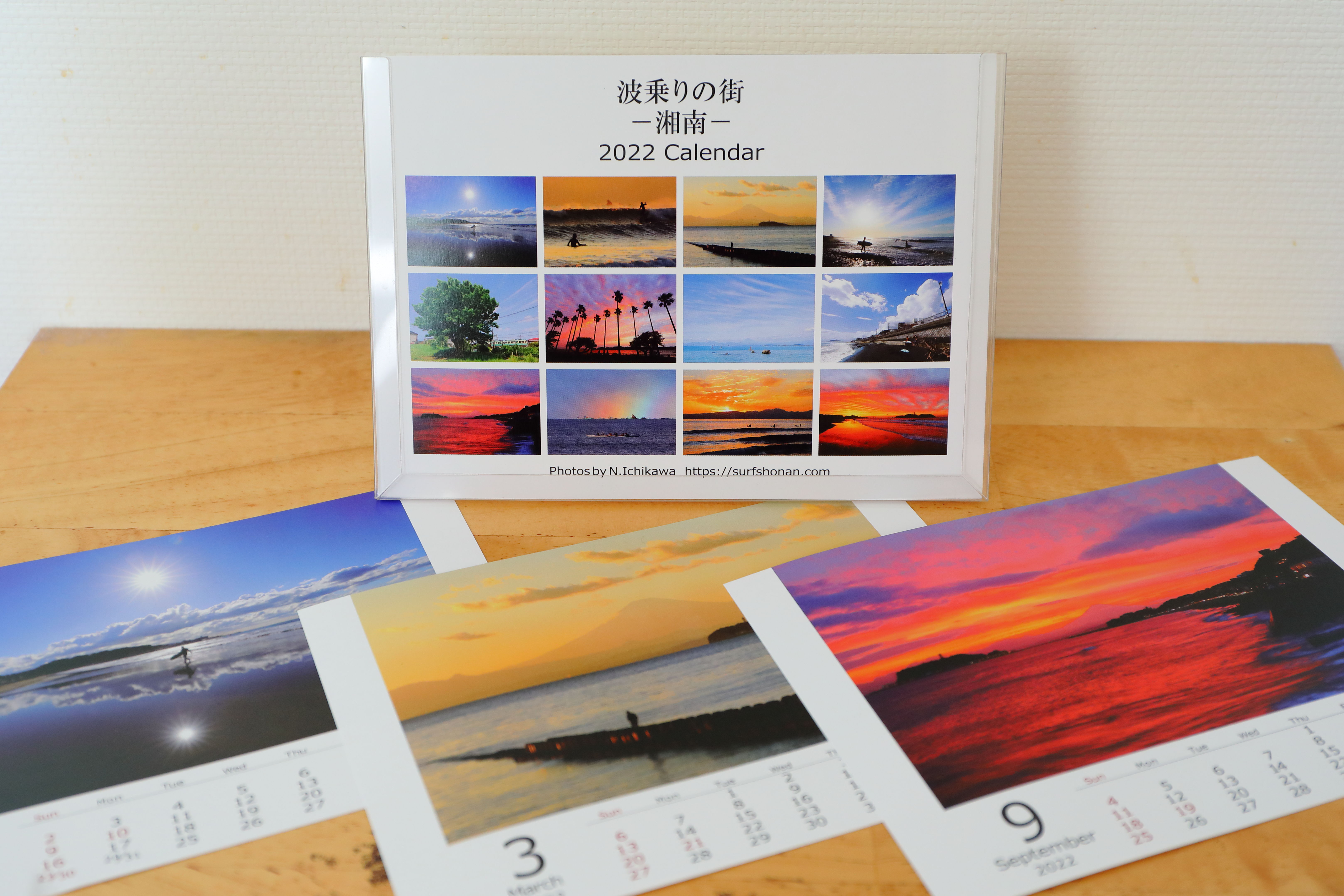 市川氏が毎年自身で制作する「波乗りの街―湘南―2022カレンダー」卓上カレンダーとのセットもご用意。