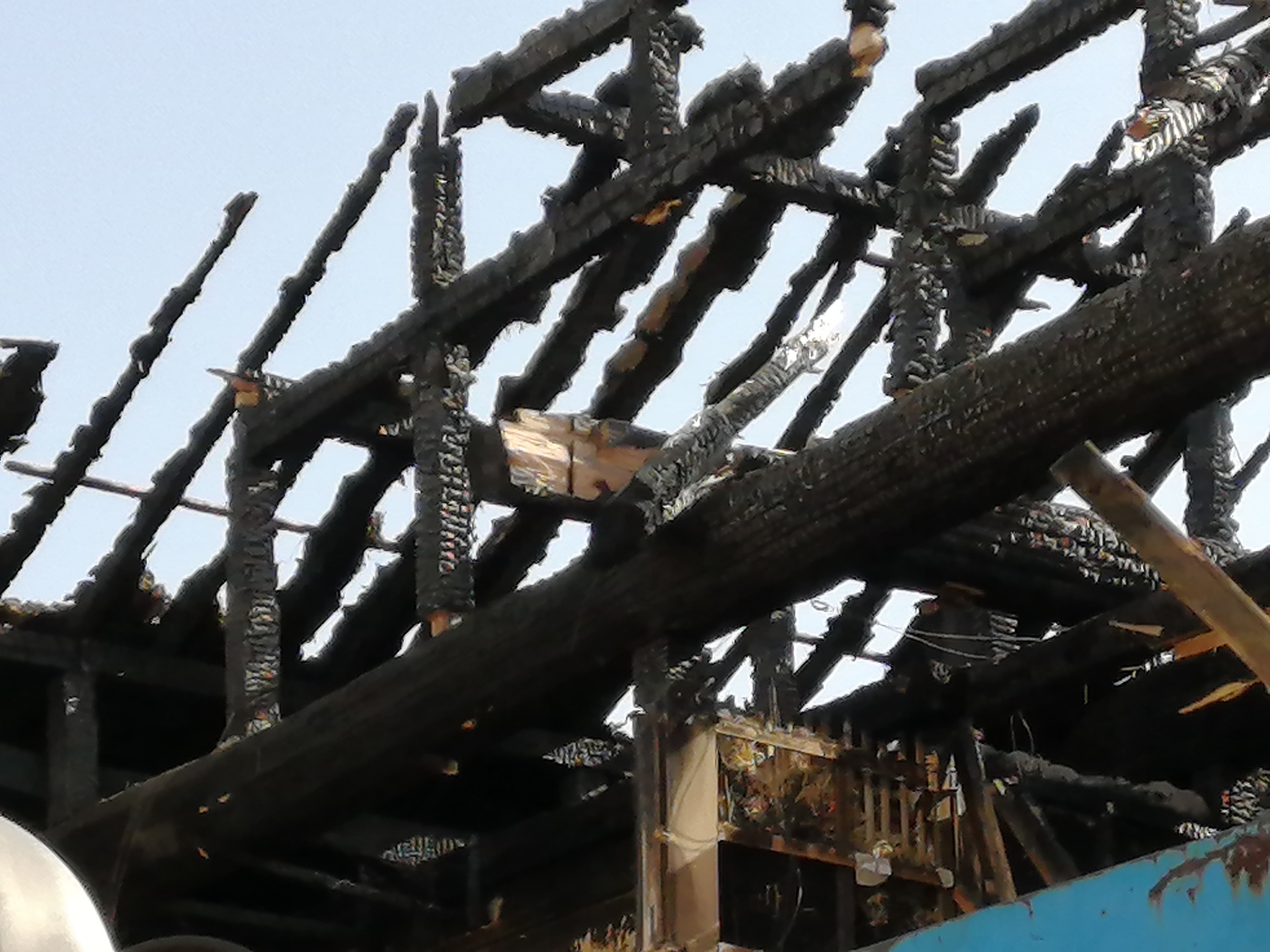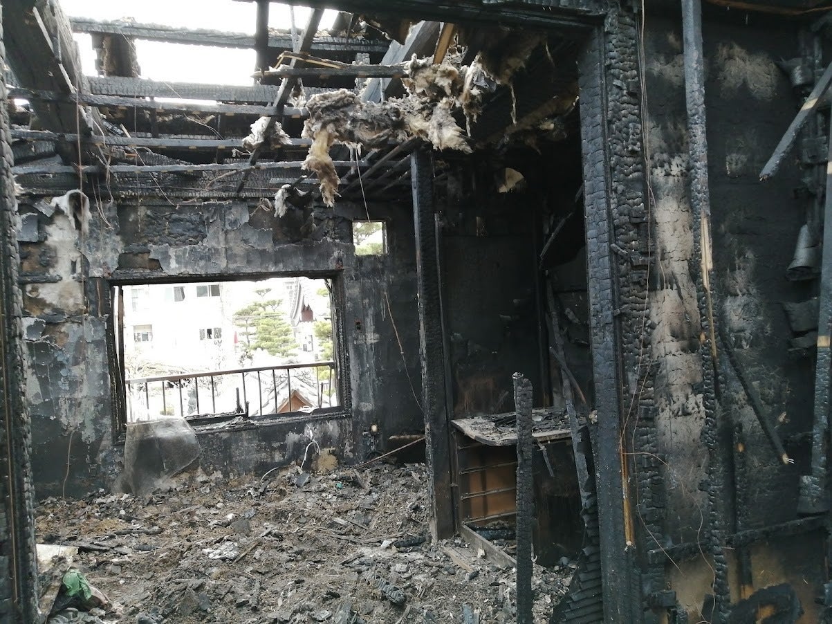 本堂の裏座敷です。本堂の屋根も火が廻っています。消火活動の跡が残ります。