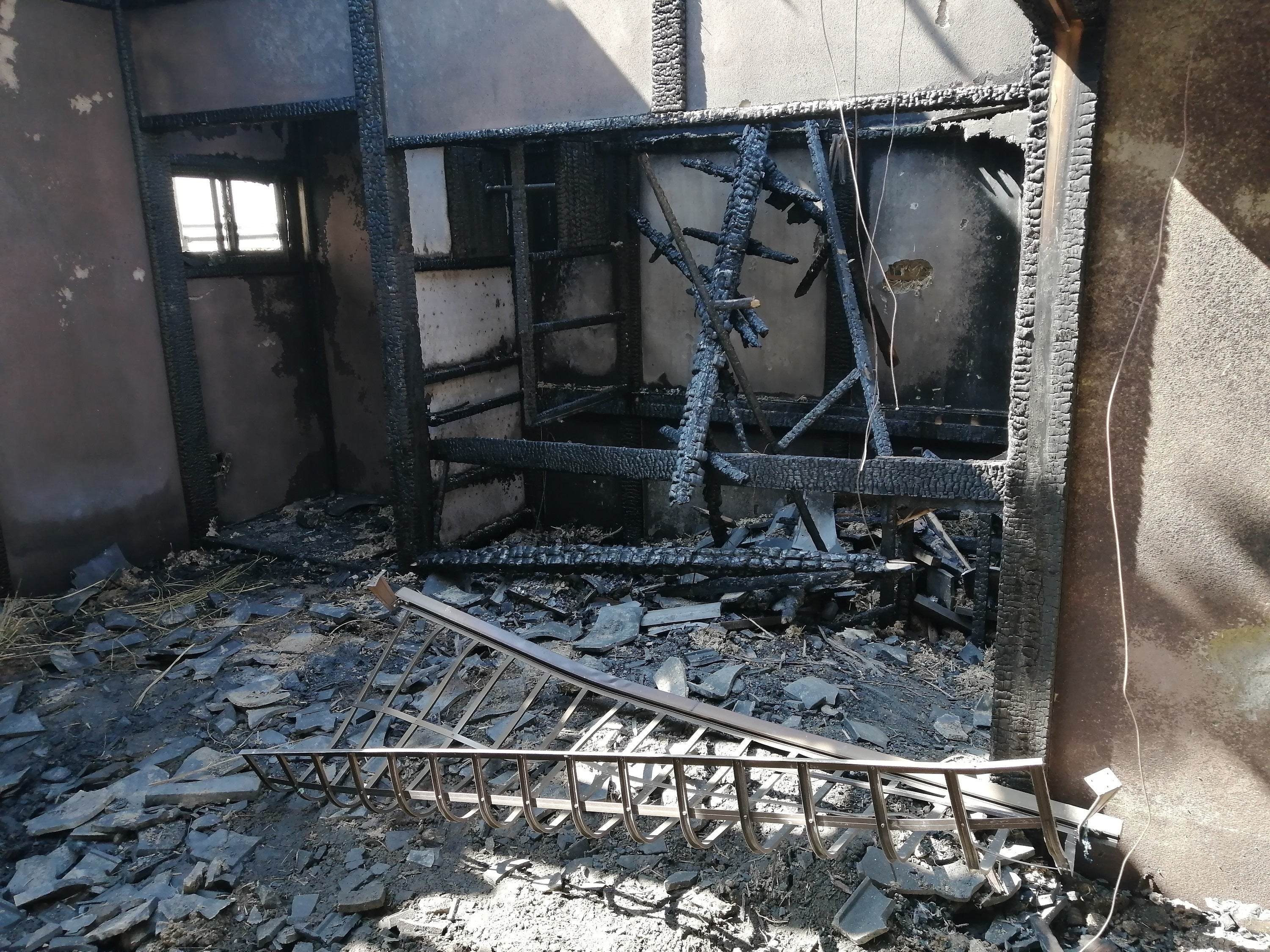 3時間半燃え続け、ガラスもサッシも溶けて曲がっています。部屋の中は瓦と土と焦げたにおいでいっぱいでした。