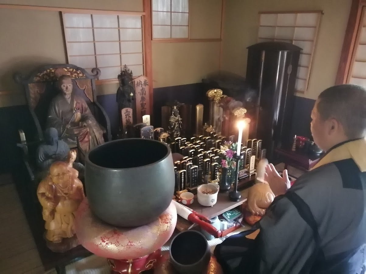 仮本堂で仏さまをお祀りし、お勤めしています。