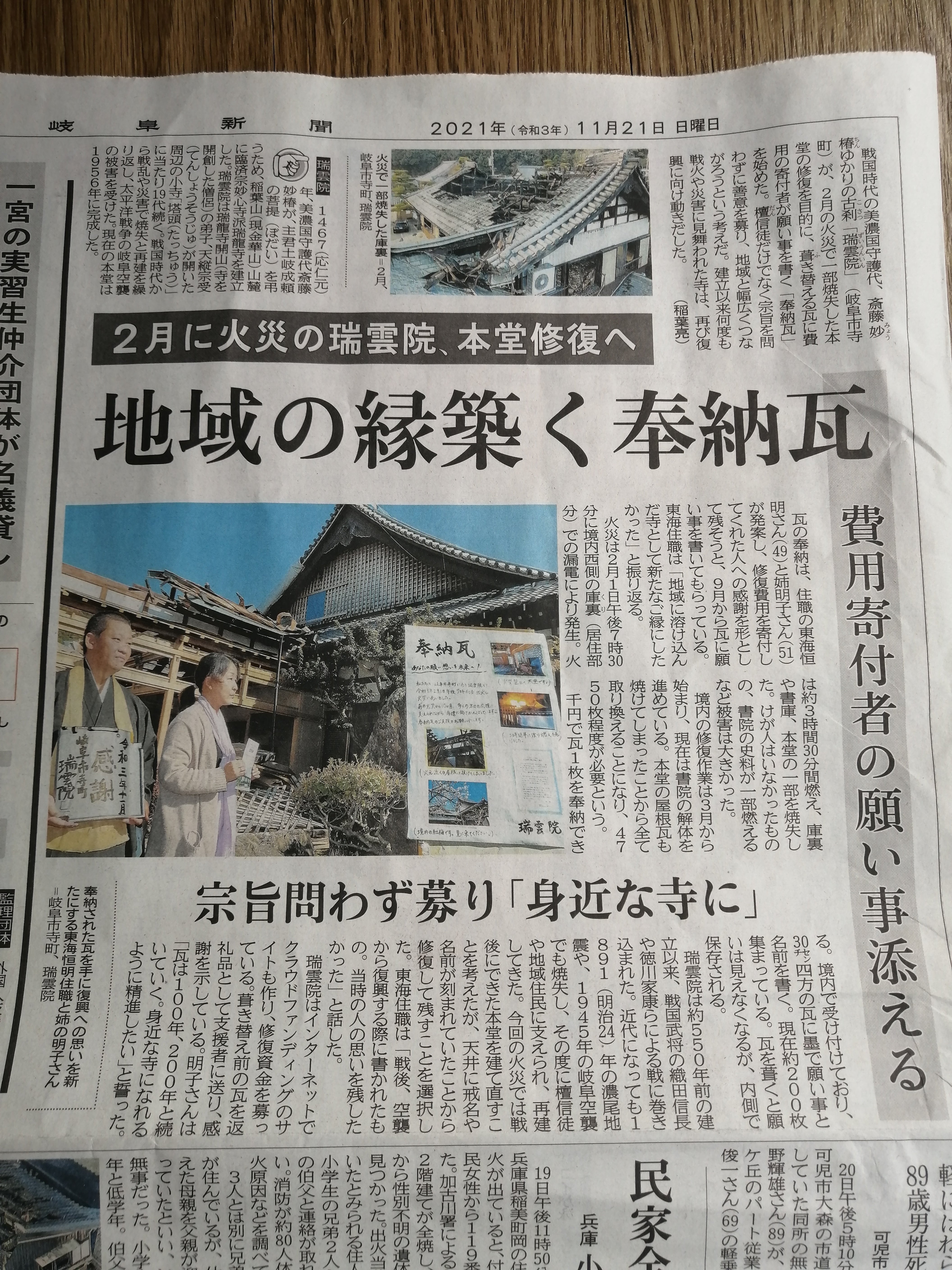 瑞雲院の【奉納瓦の取り組み】について、岐阜新聞に掲載されました。このクラウドファンディングのことも少し載っています。