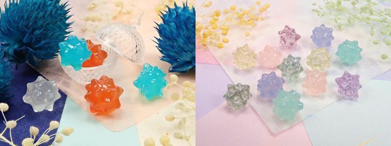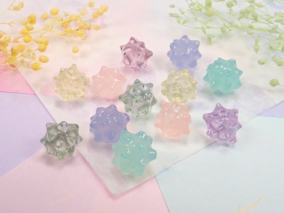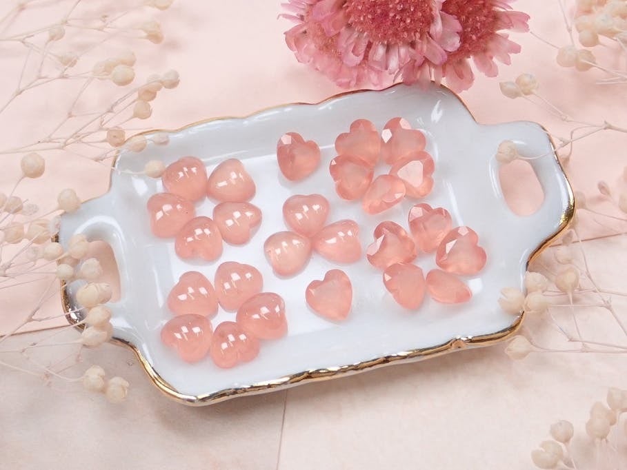 宝石彫刻機で突起の配置を考慮し少しずつ削っていくため、1日1〜2個が限界といわれる程、高い集中力と労力を要して作られています。金平糖に相応しい色や質感を出すために、原石選びから慎重に行い、一つ一つ丁寧に仕上げられている作品です。